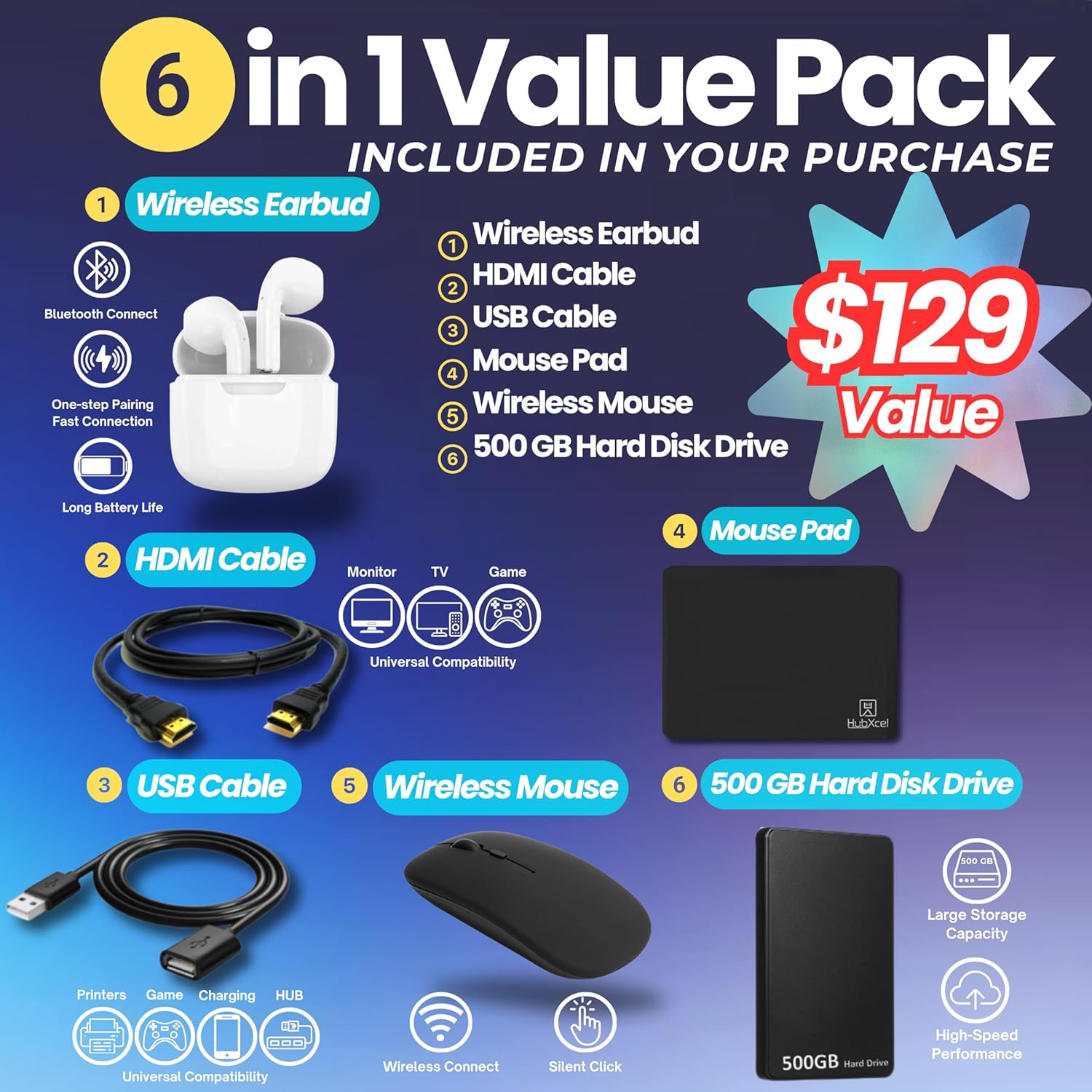 - [6-in-1 HubxcelAccessory with 1-Year MS Office 365] HubxcelAccessory includes wireless earbuds, 64GB SD card, USB extension cord, HDMI cable, mouse pad, and wireless mouse. Free Microsoft Office 365 Personal 1-year subscription included Al Powered Copilot. For Home, Student, Professionals, Small Business, School Education, and Commercial Enterprise.