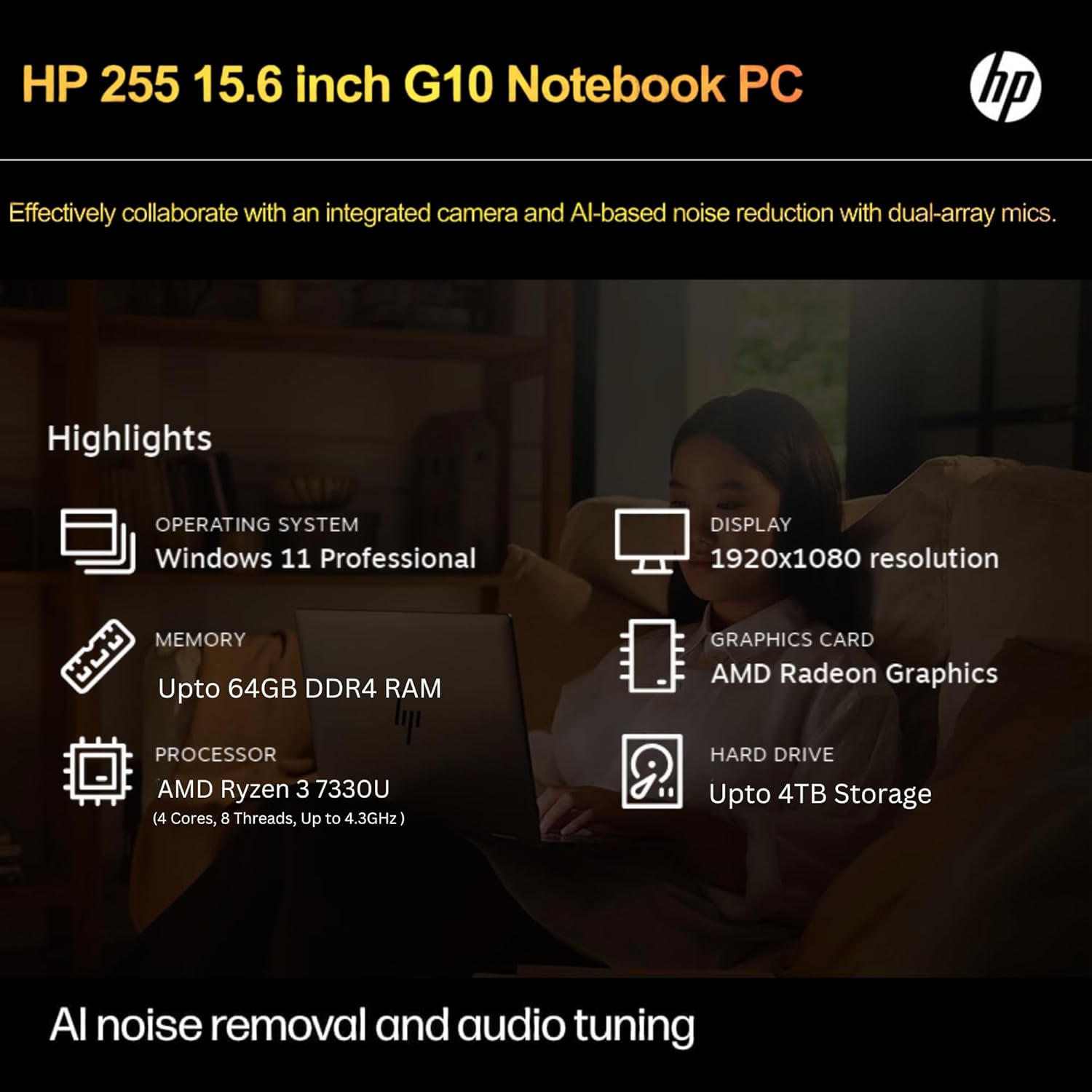 About HP 255 G10 Laptop for Home or Work, 16GB RAM, 1TB SSD, 15.6″ Full HD, Ryzen 3 7330U (Beat Intel i5-1135G7), HDMI, USB-C, Windows 11 Pro, Business and Fun Ready