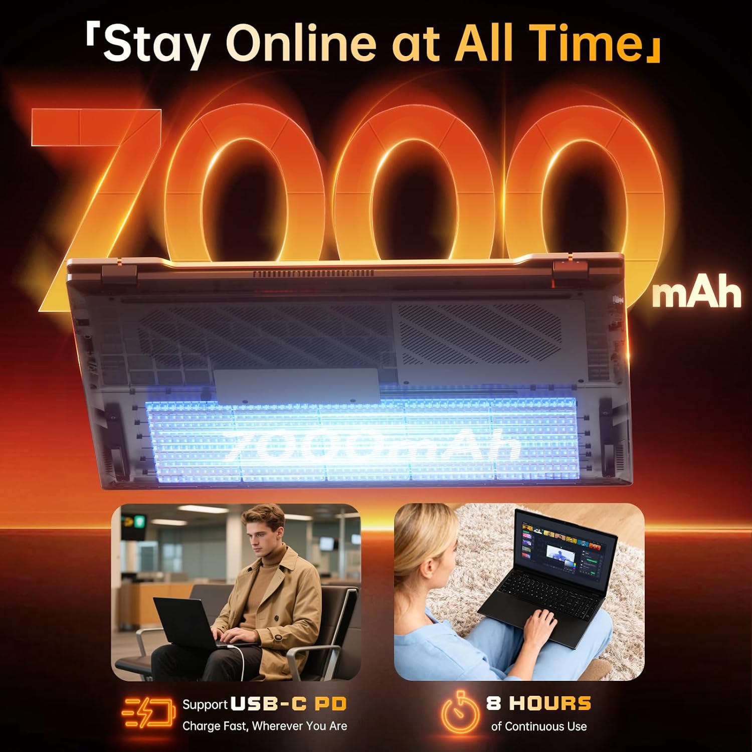 Powered by a 7000mAh (38Wh) battery, this laptop offers up to 8 hours of usage on a single charge. Fast-charging capability minimizes downtime, making it ideal for students or professionals on the move.