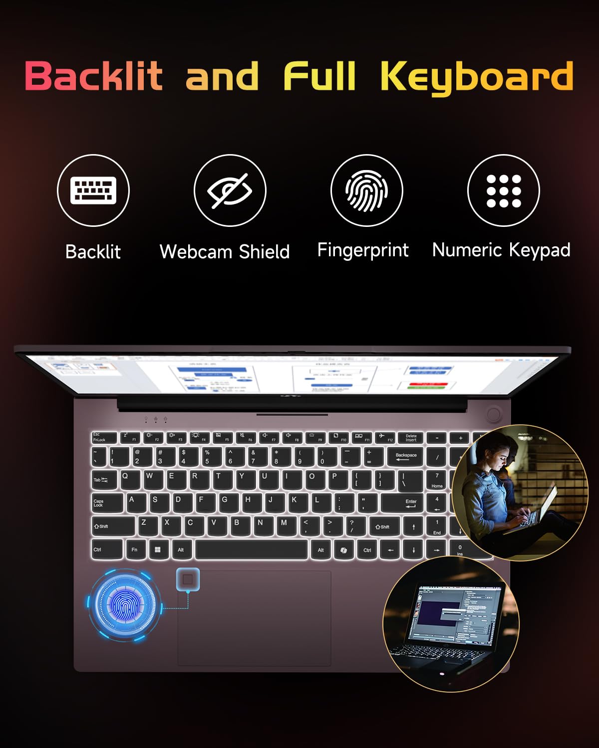 • 【Ergonomic Backlit Keyboard for Any Environment】Don’t let low light slow you down. The NIMO laptop features a backlit keyboard, letting you work comfortably in dim settings—like a late-night library study session or a softly lit cafe. The bright, evenly distributed backlit keys are easy on the eyes, ensuring you type accurately and efficiently no matter the situation. Simply toggle the backlight on or off and adjust brightness to fit your needs.