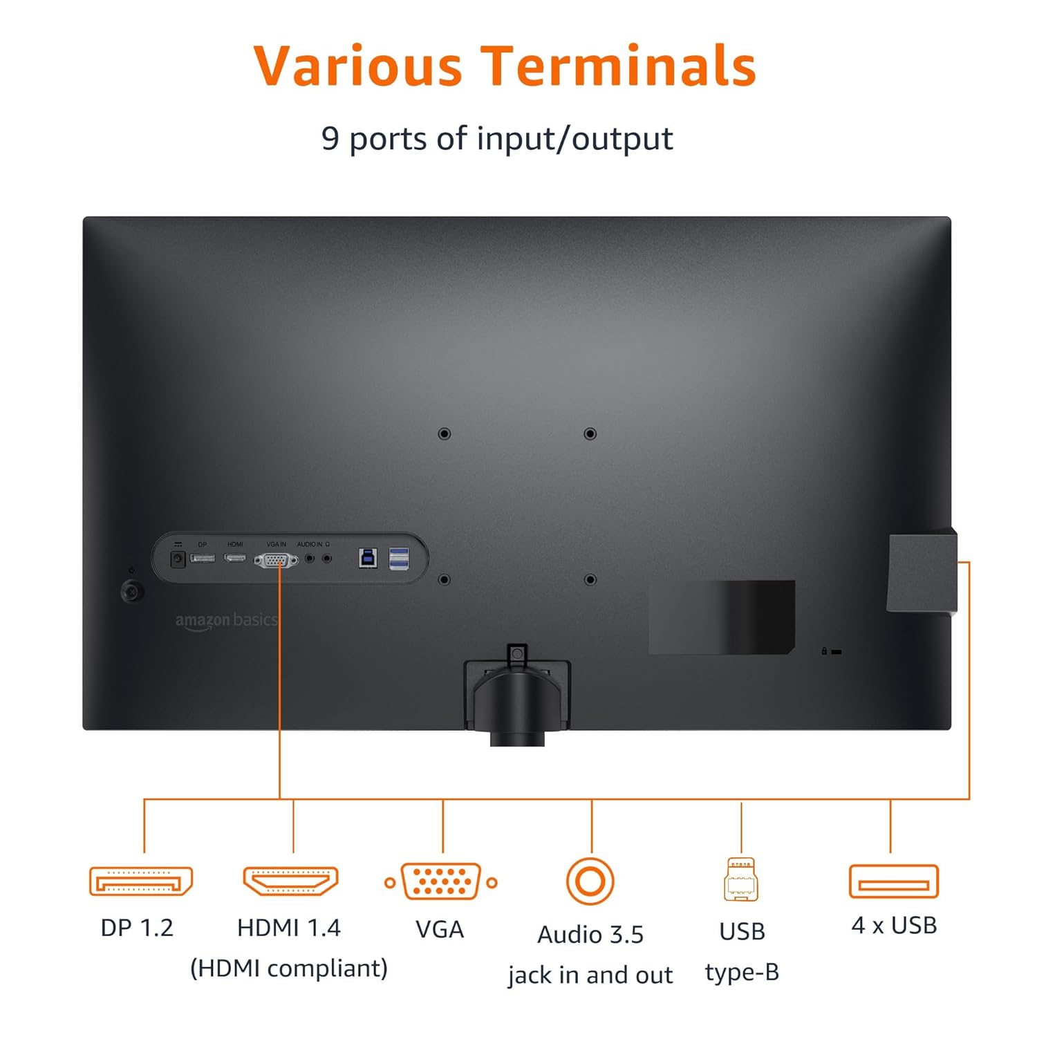 About Amazon Basics 27 inch Monitor, FHD 1080P, Max 100Hz, VESA Compatible, Built-in Speakers, Black