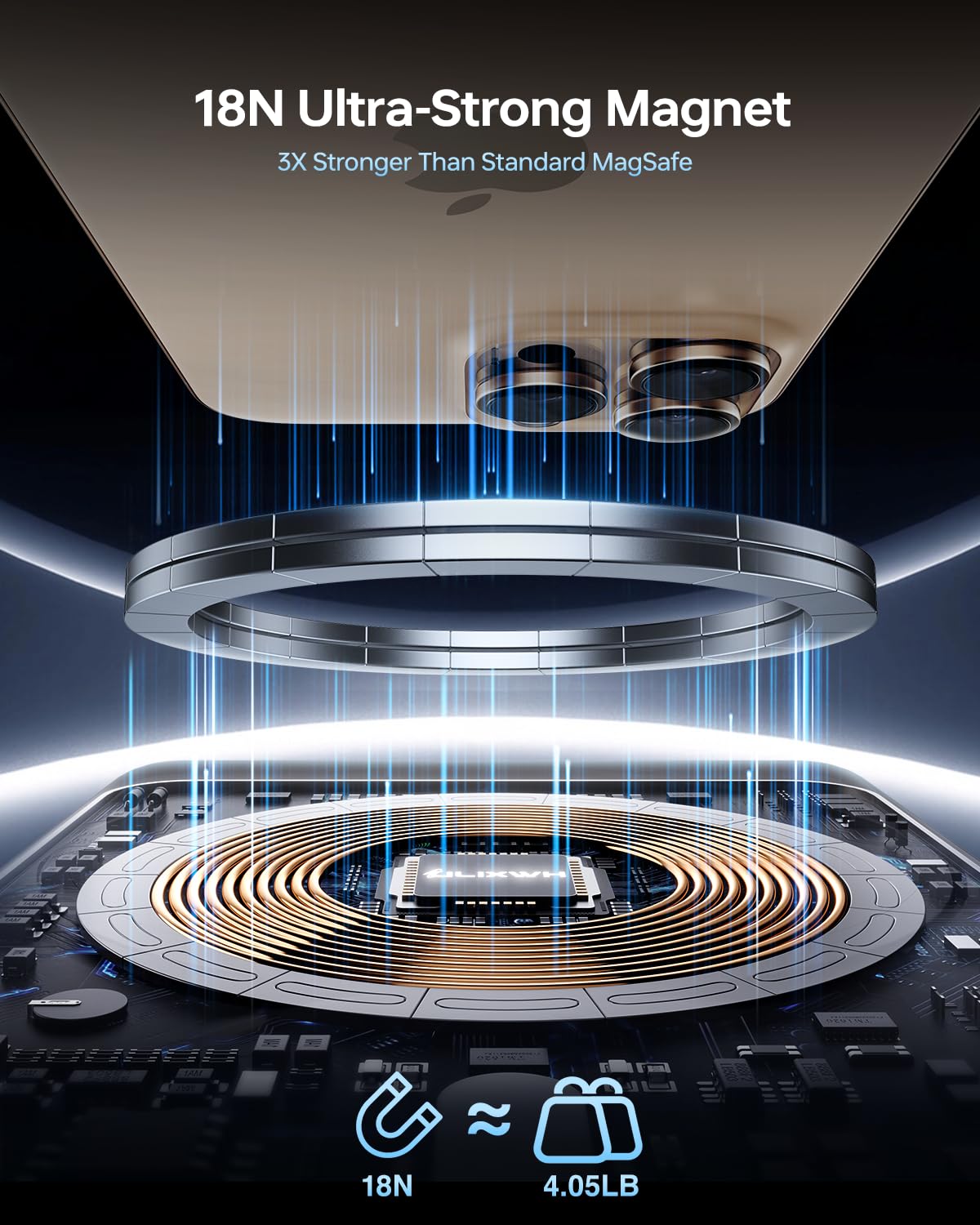 - [ Military-Grade 18N Magnetic Hold ] Forget messy cables! With an ultra-strong 18N ultra-strong magnetic force (4x industry standard), this slim magsafe power bank securely snaps onto your phone and stays firmly in place—auto-aligns in 0.3s. *Lab tested with iPhone 16 Pro Max at 25mph treadmill speeds. Zero charging interruptions.