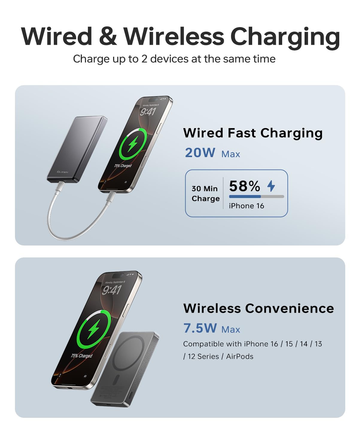 - [ Fast Wireless Charging Power Bank ] Equipped with an advanced lithium-polymer battery and NTC temperature control chip, this 10,000mah ultra-slim power bank delivers 3x faster charging. Supports 20W wired and 15W wireless charging (7.5W for iPhone) Smarter than ever, charging slows after 75% to prevent overheating & extend battery life