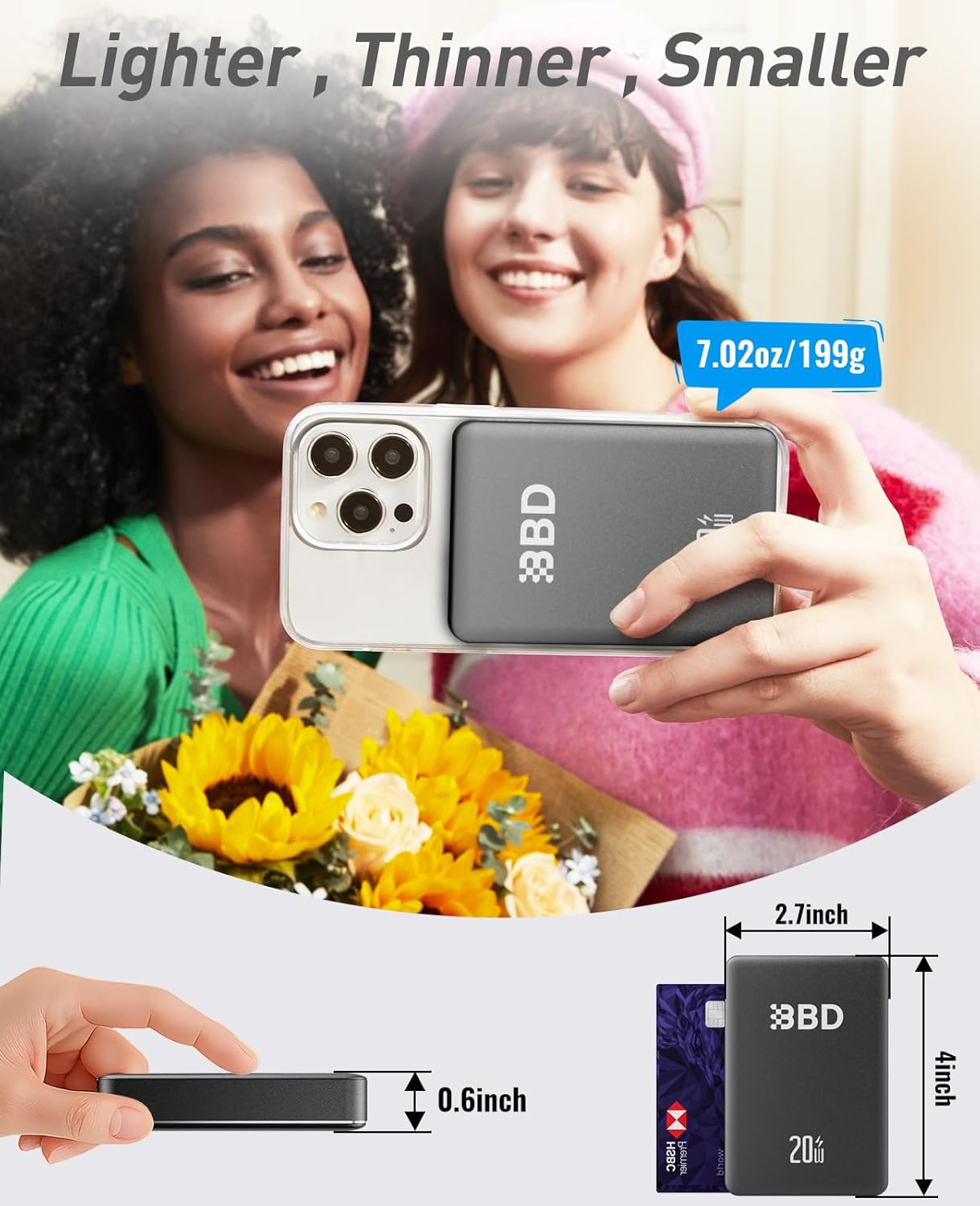 I really like this BBD MagSafe power bank! It’s super slim and light, easy to carry in my purse or pocket. The magnet is strong and it stays perfectly on my phone. Charging speed is great too, enough for a full day out. Perfect for travel, shopping, or just daily use — totally worth it!