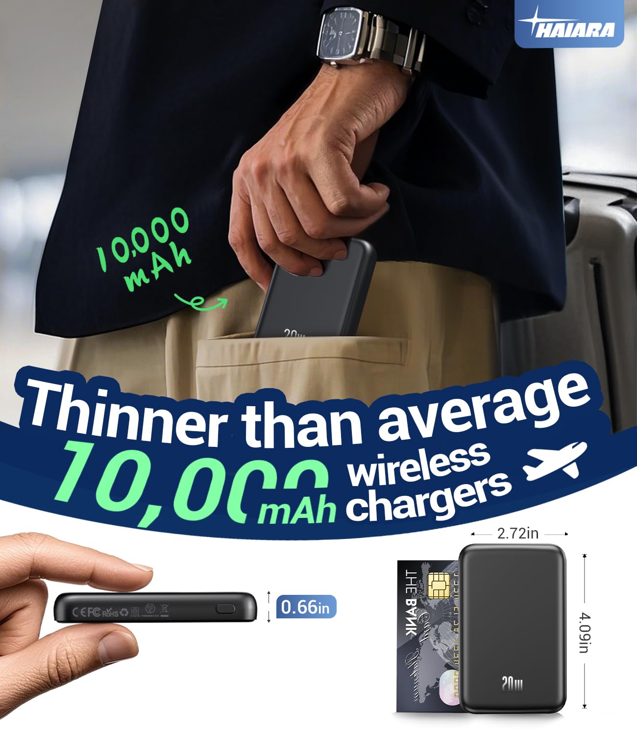 - Ultra-Thin Design & Credit Card Size: At just 0.66-inch thickness (20% slimmer than average 10,000mAh wireless chargers) and 4.09×2.72-inch credit card dimensions, this 0.41lb portable charger power bank fits effortlessly in pockets or small bags—ideal for airport security lines and daily carry.