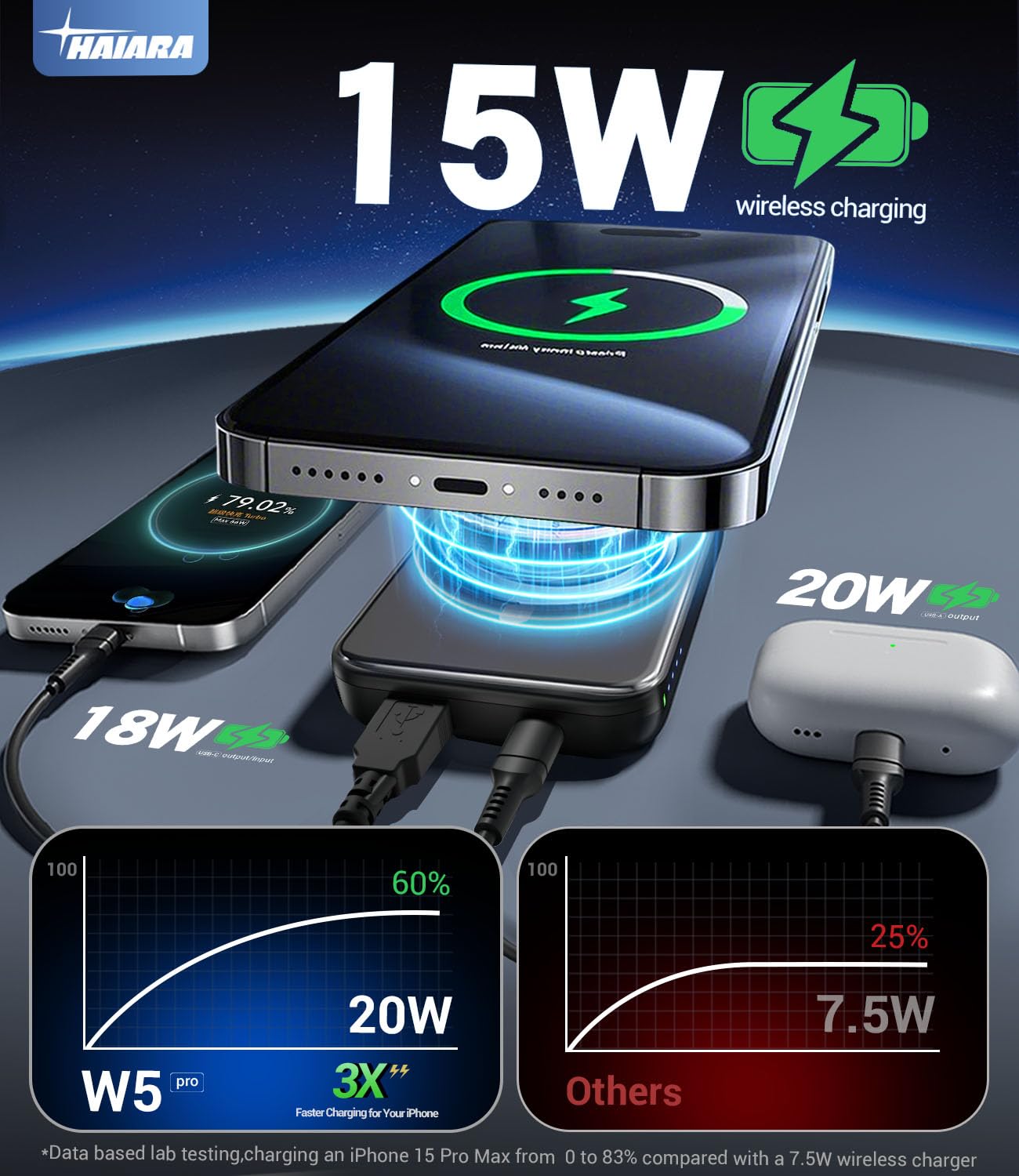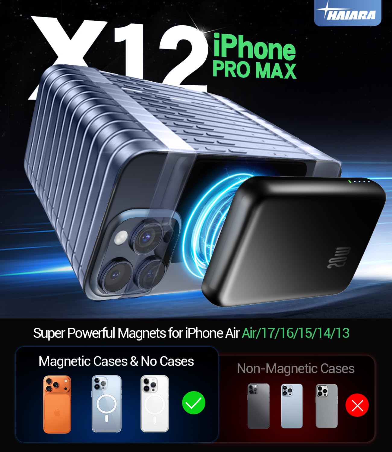 - Strong Magnetic Charging & Wide Compatibility: HAIARA portable charger is perfectly compatible with iPhone Air/17/16/15 Pro Max/Pro/Plus, 14/13 series Equipped with 1500g magnetic force, firmly attaches to your phone even during outdoor activities. No more dropping issues! (Note: Remove thick non-magnetic cases for optimal).