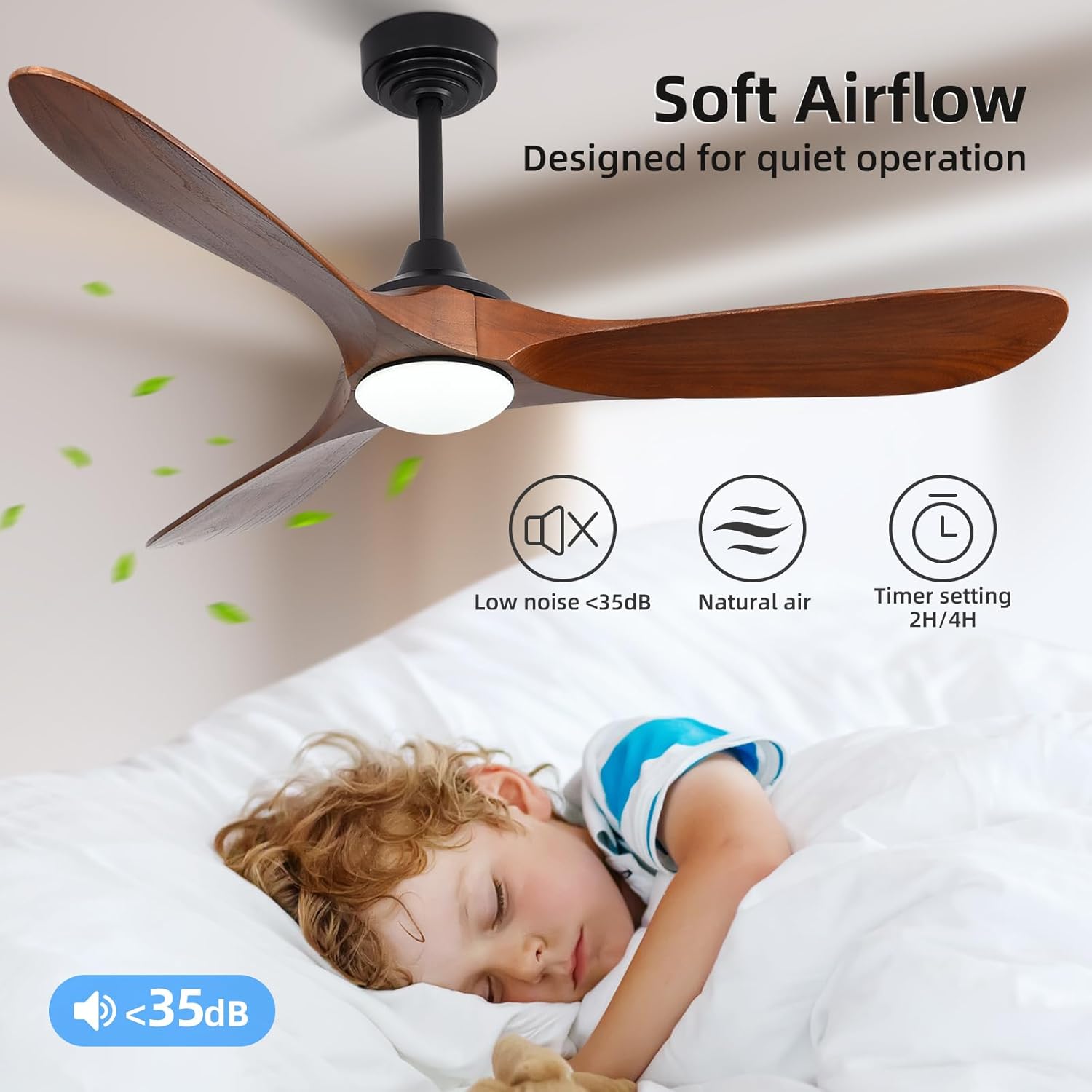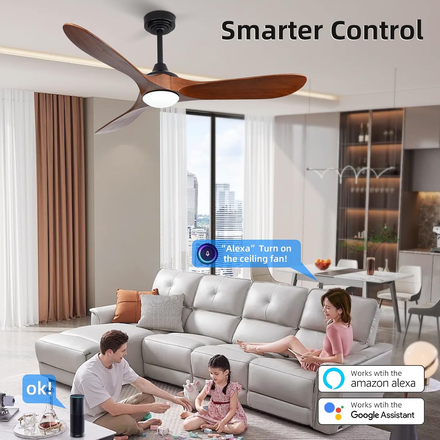 About 52” Outdoor Ceiling Fan with Light and Remote via WiFi Alexa, 3 Walnut Solid Wood Blade, Noiseless Reversible Dc Motor, Smart Outdoor Wood Ceiling Fan for Farmhouse Patios, Walnut
