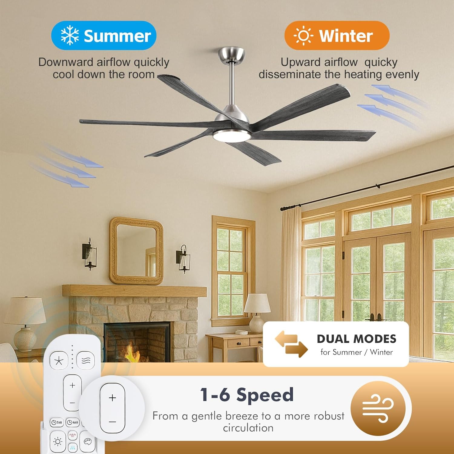 - ใPowerful Six-Speed Airflow for Year-Round ComfortใExperience a refreshing breeze with our high-performance ceiling fan. Featuring six speeds, it delivers rapid, continuous cooling for spaces like living rooms, patios, or large open areas. Designed for efficiency, it circulates 85% more air than standard fans while running quietly, ensuring comfort without noise. Perfect for large rooms or any space needing powerful airflow without compromising performance. Stay cool and comfortable all year long
