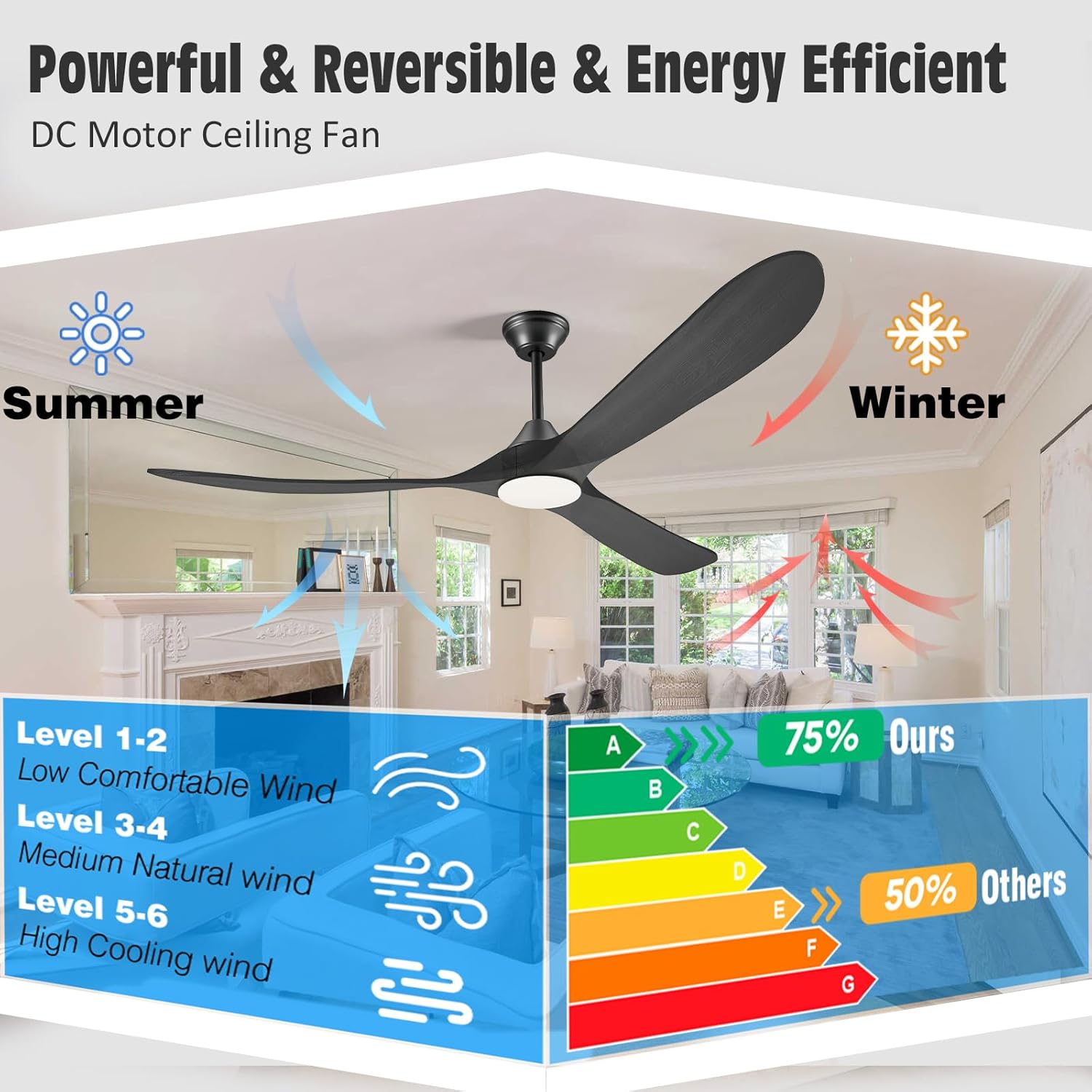 - Noiseless Reversible Ceiling Fan – DC motor ensures efficient and stable operation, 3 solid wood blades are robust and steady, eliminating any drooping or wobbling to create a noise-free environment (≤30dB), perfect for sleep study or work. Black ceiling fan with light offers 6-speed settings and generates an impressive airflow, ensuring optimal air circulation. The fan also can reverse airflow direction for year-round use, enhancing the fan’s use efficiency and adding comfort to your home