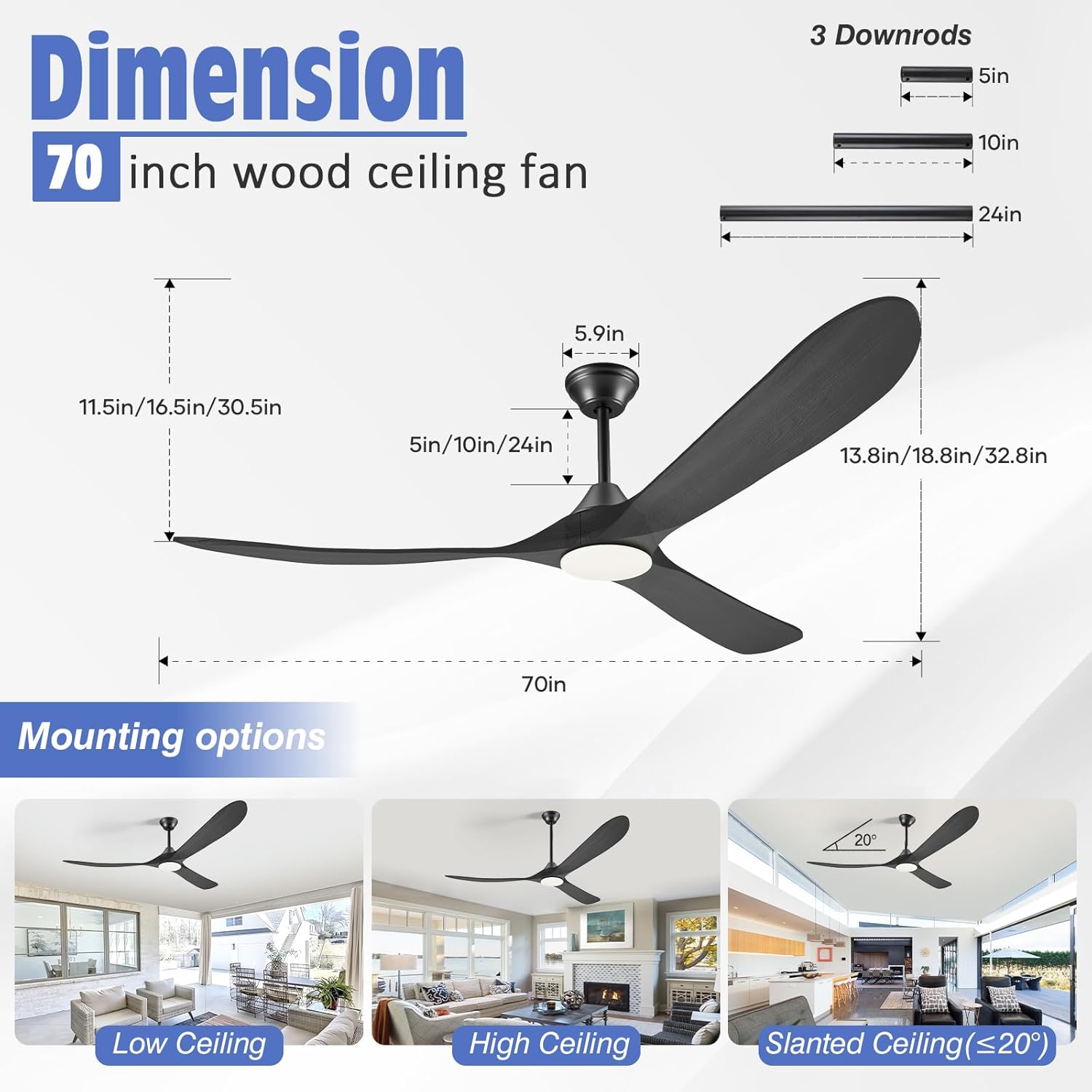 - Solid Wood Ceiling Fans with Lights – The 70 inch ceiling fan with light is crafted from natural solid wood, durable stable not deformed, and not fading for a longer lifespan. Based on the aerodynamic principle, propeller blades circulate air effectively to instantly cool down your space while enhancing visual appeal to elevate home decor. Solid wood offers some moisture resistance, ideal for indoors & covered outdoors, such as living room bedroom kitchen patios porch gazebo garage shop, etc