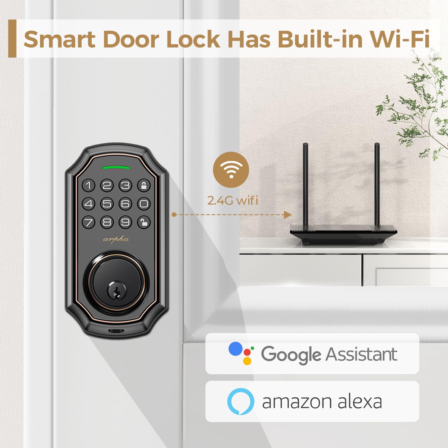 About Arpha Keyless Entry Door Lock, WiFi Smart Keypad Front Door Deadbolt, Supports Amazon Alexa Voice Control, Google Assistant, Online App Control, Anti-Peeping Password, One-Time…