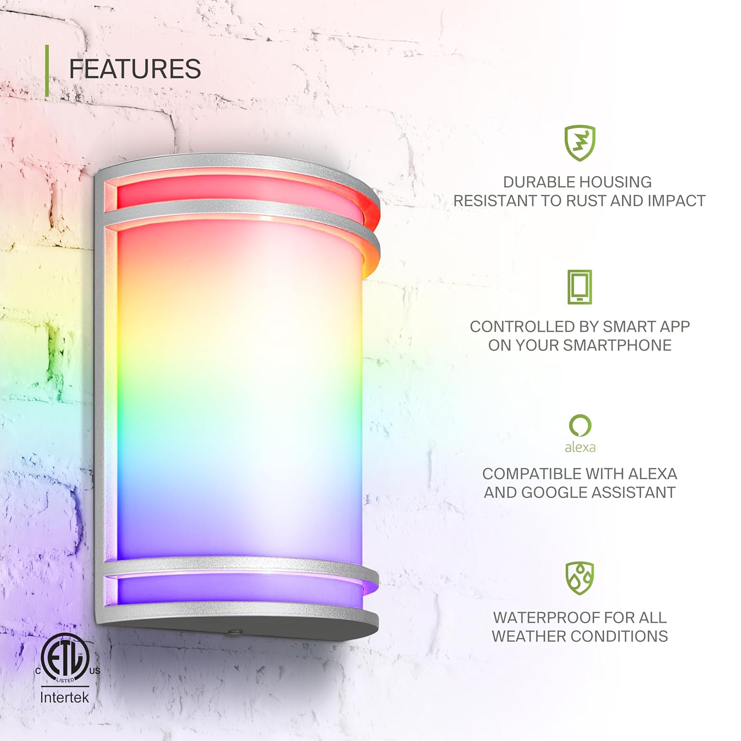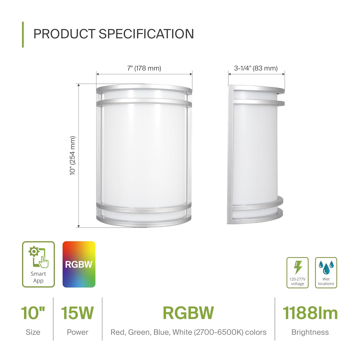 Specification: ASD 10 Inch Smart RGBW LED Outdoor & Indoor Wall Mount Light Fixture – Nickel RGB Wall Sconce Exterior Lighting – 120-277V 15W 2700-6500K Dimmable, Remote Control, Alexa – Front… by ASD