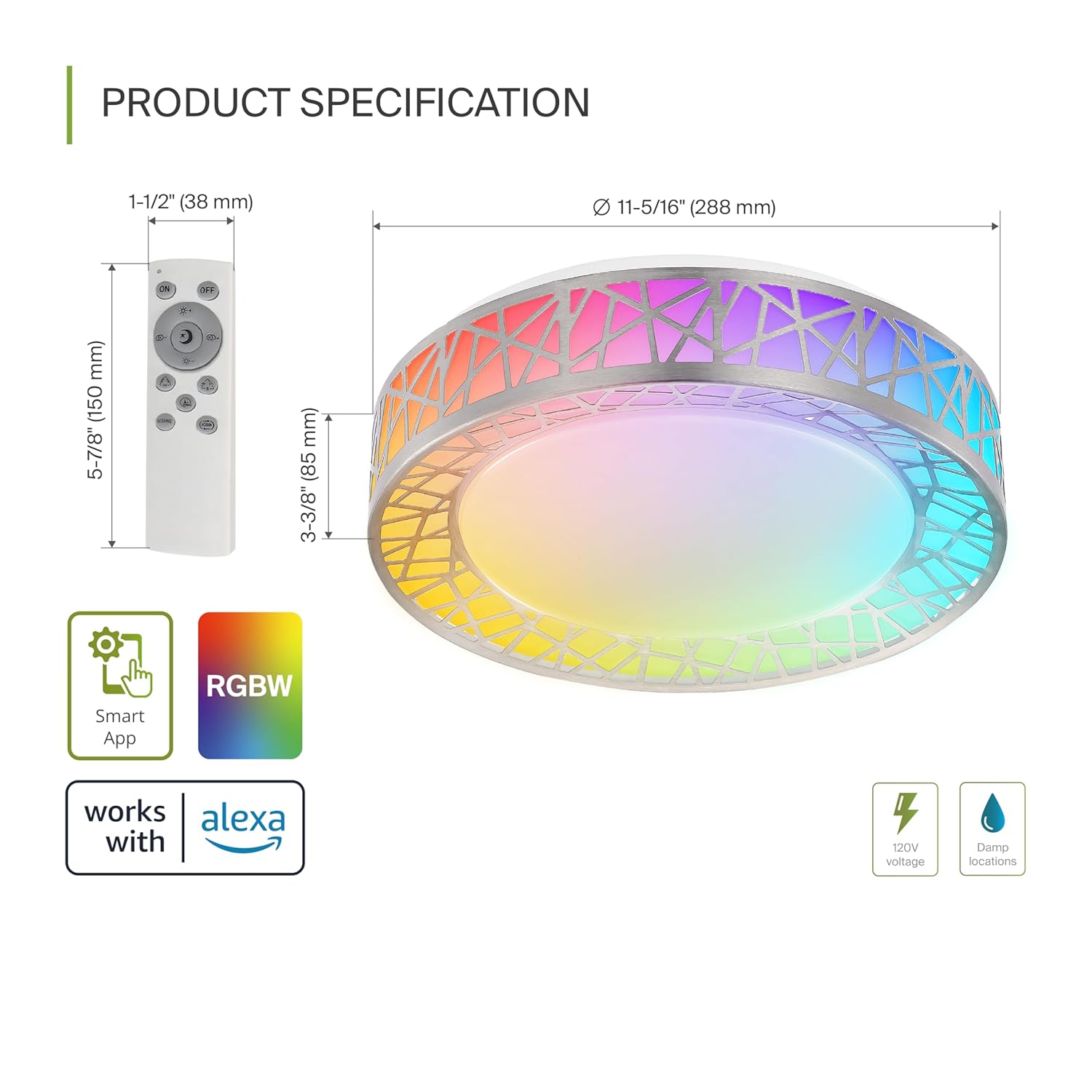 Specification: ASD 12 Inch Smart RGBW Flush Mount Ceiling Light with Remote – Brushed Nickel 20W 120V 2700-6500K Dimmable Ceiling Light Fixture, WiFi App Control RGB Lights, Alexa & Google… by ASD