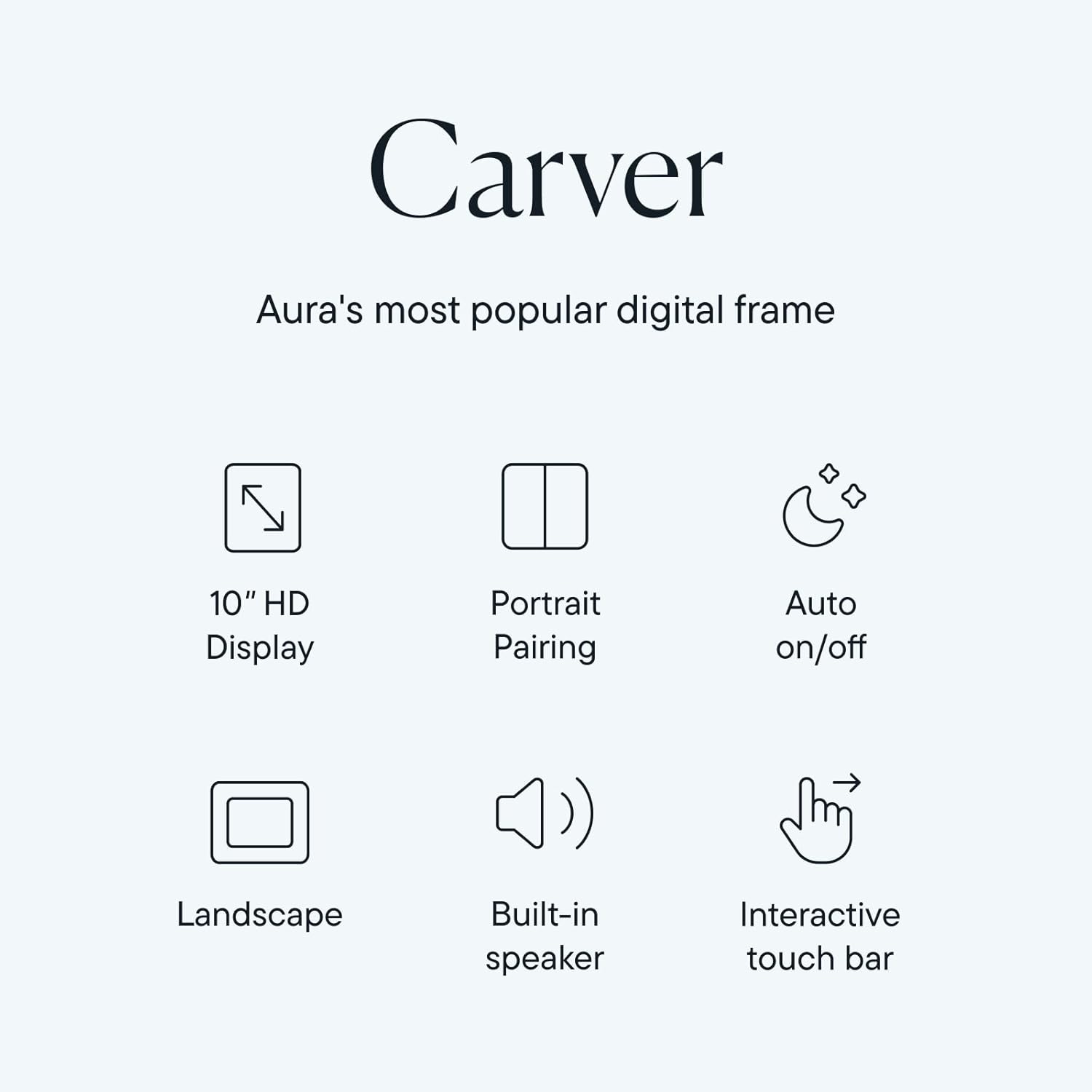- SMART FEATURES: Designed with high-quality materials and a color-calibrated HD display, the Aura Carver landscape frame automatically manages photo cropping, screen brightness, auto on/off, and more.