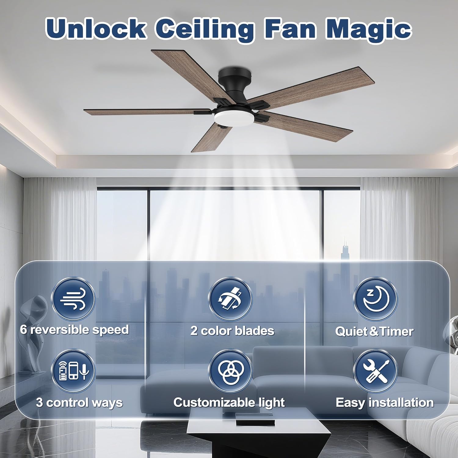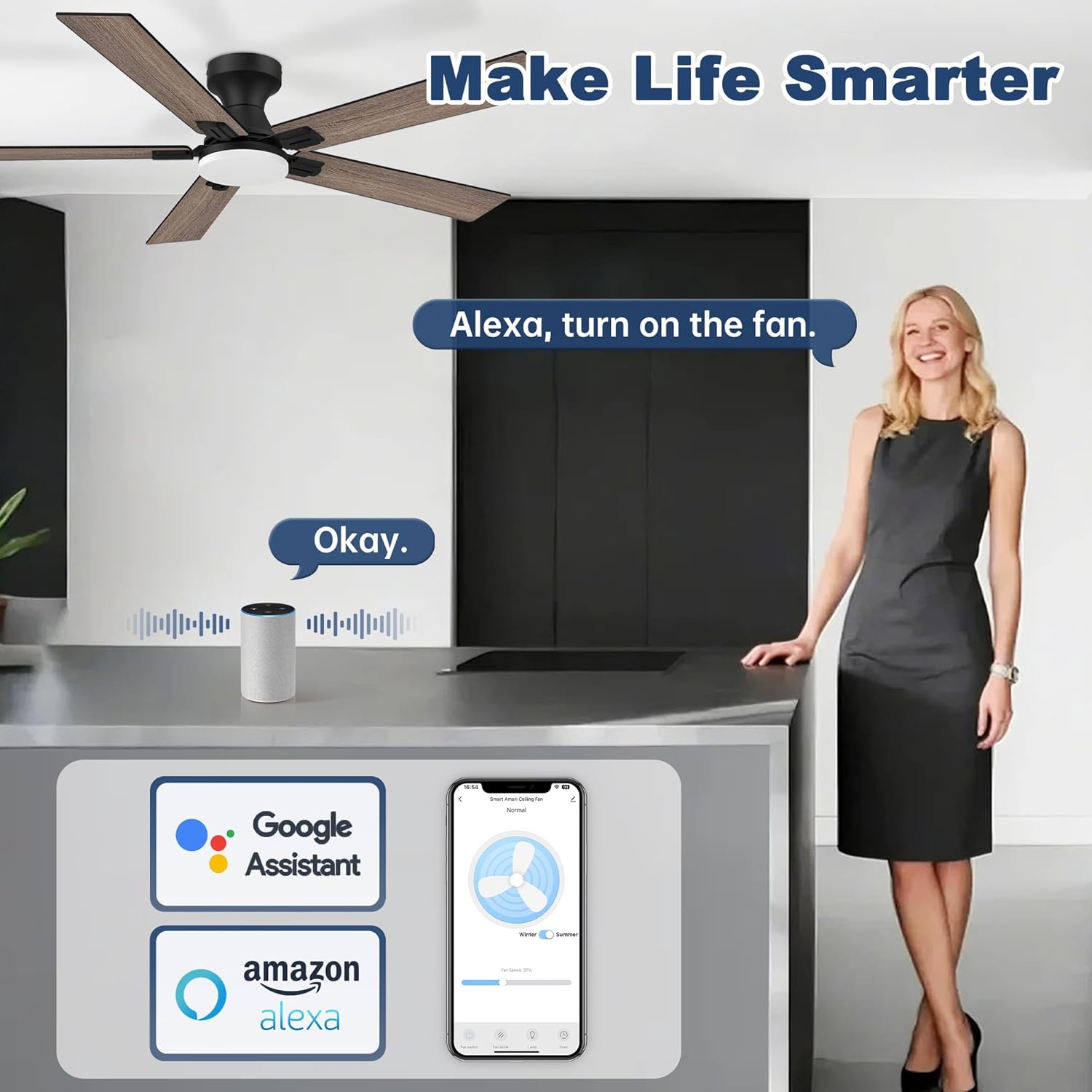 - 【APP/Remote/Voice Control】 Our Smart Ceiling Fans with Lights come with remote control,APP control and wifi voice control via Alexa and Google assistant, allowing you to effortlessly adjust the fan speed, dim the lights, and integrates into your smart home simply,truly making your living space more intelligent and convenient.
