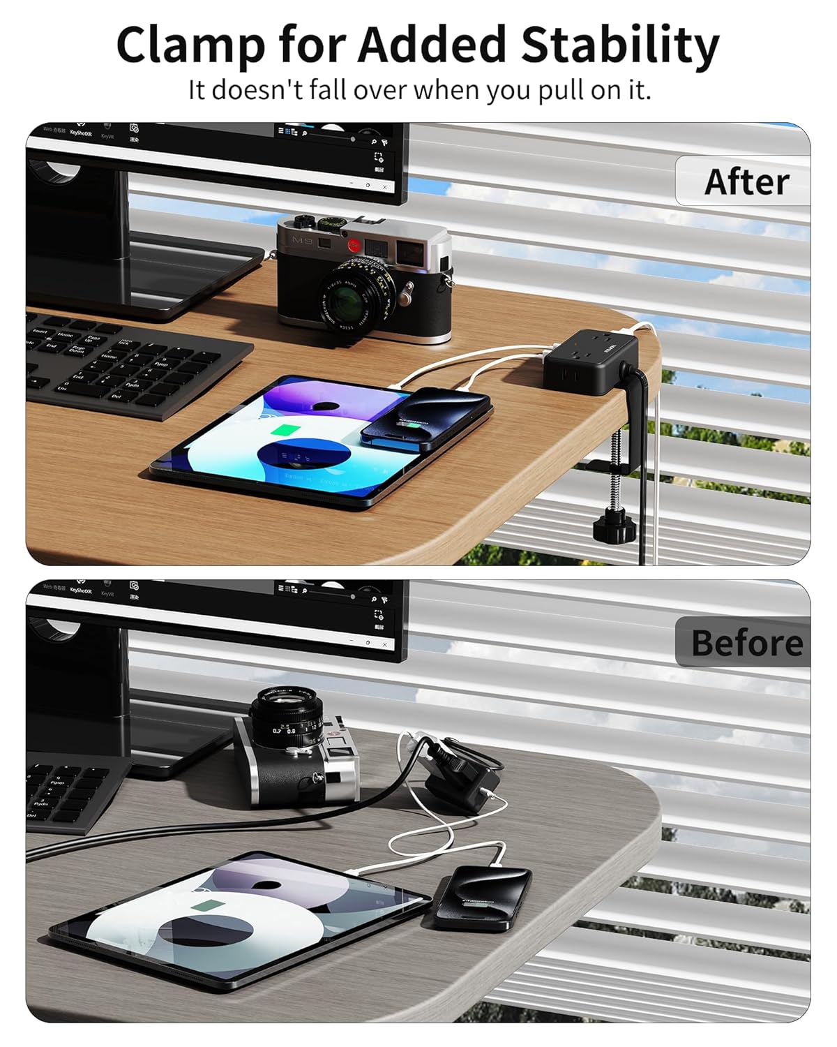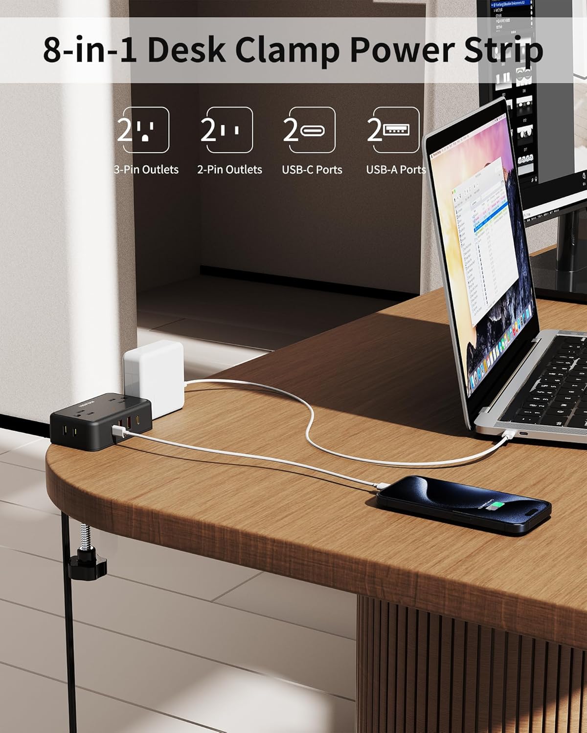 - 【8-in-1 Desk Clamp Power Strip with Smart USB Ports 】Equipped with 4 AC outlets and 4 USB ports, this desk power strip turns 1 outlet into 8, allowing you to power 8 devices simultaneously to save more time. No need to find plugs or adapters for USB devices, this desktop charging station is equipped with 2 USB-C port and 2 USB-A ports, built-in smart charging technology allows the USB to intelligently detect your electronic devices and charge for your smartphone, tablet, smartwatch, and more.