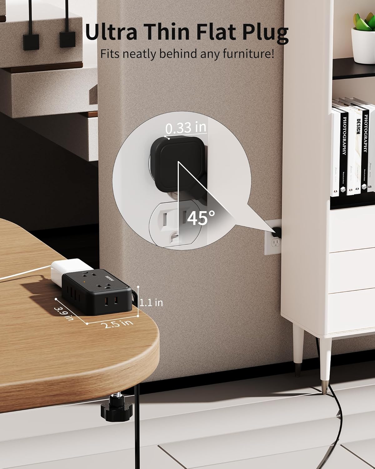 - 【Wide Spaced Outlets & No Installation Required】The spacing between the sockets is 1.62in, wide spaced outlets sufficiently far apart that even pretty bulky plugs or adaptors can be plugged in. (Note: Desktop power strip require no installation and are ready to use upon receipt)