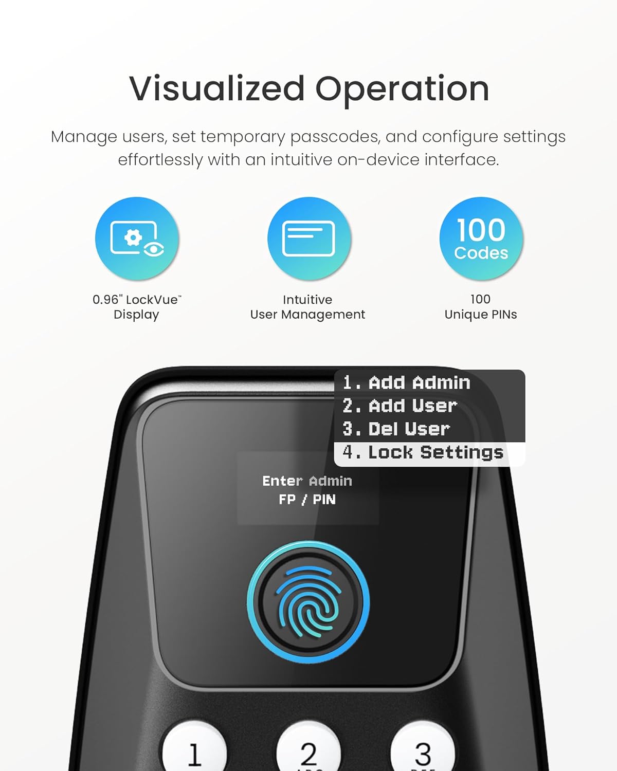- 𝐋𝐨𝐜𝐤𝐕𝐮𝐞 𝐃𝐢𝐬𝐩𝐥𝐚𝐲: Manage settings, set passcodes, assign users, and view alerts on a smart lock with a built-in display that provides a clear overview. No internet connection is required
