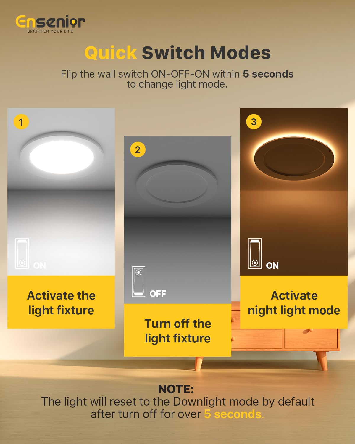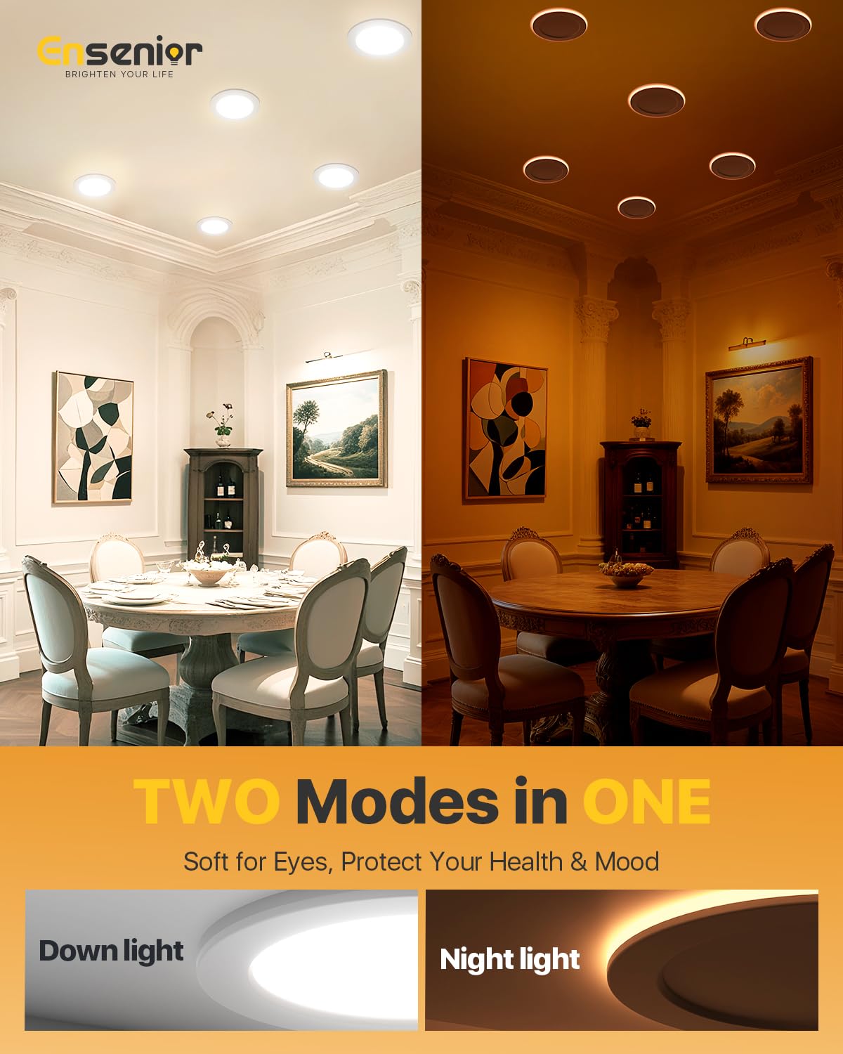 Photos: Ensenior 24 Pack 6 Inch LED Recessed Ceiling Light with Night Light, Dimmable, 2700K-5000K 5CCT, 1050LM 12W 120V, High Brightness Canless Wafer Downlight – FCC by Ensenior