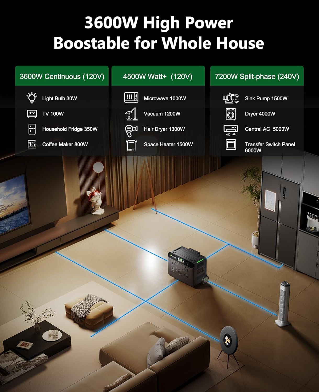 - 【Tremendous Power at Your Reach】The Plug & Play 3684.6Wh battery with 3600W AC output (4500W with Watt+) supports 99% of daily essential appliances for a relatively long time. 16 versatile output ports make it ideal for RVs and home emergencies.