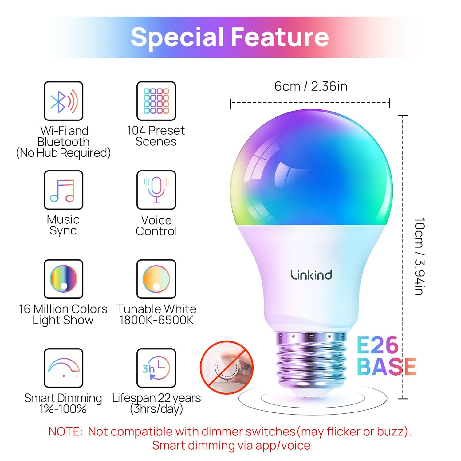 Specification: Linkind Smart Light Bulbs, Smart Bulb That Work with Alexa & Google Home, LED Light Bulbs Color Changing, 104 Preset Scene, Music Sync, A19 E26 2.4GHz RGBTW WiFi Bluetooth Light… by Linkind