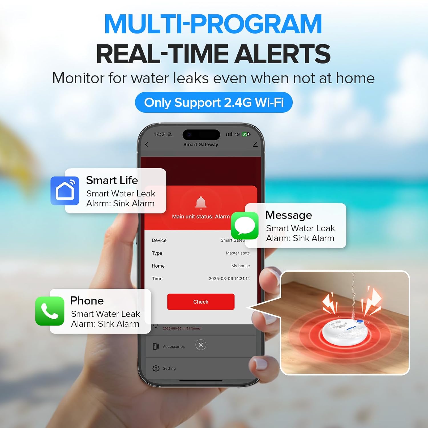- Multi-Channel Real-Time Alerts:Our Water Leak Detector delivers multi-channel instant alerts via SMS, Phone Calls, and APP notifications – ensuring prompt awareness even when you’re away. Share device access with family for real-time status monitoring anytime,anywhere