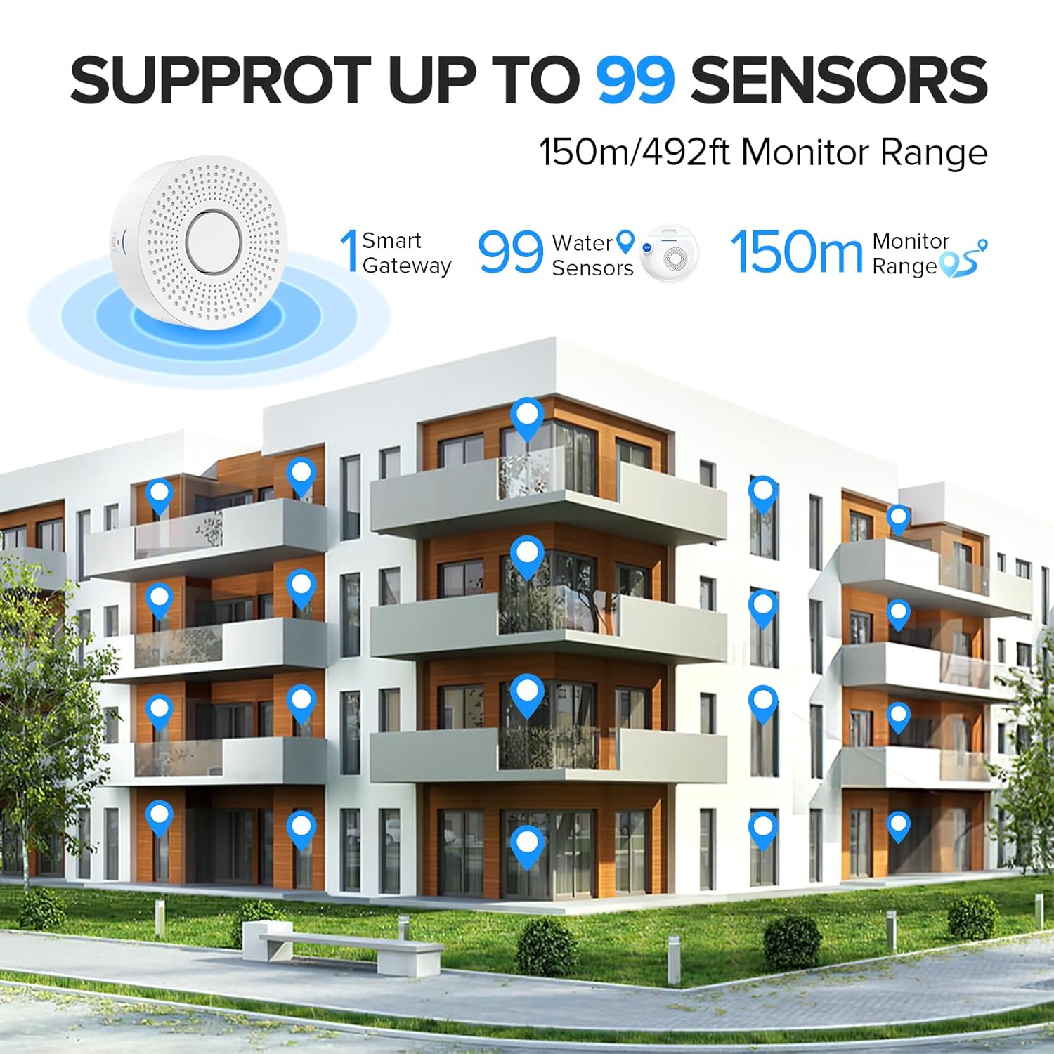 - Whole-Property Coverage: 1 Smart Gateway can manage up to 99 Water Leak Sensor over 150m/492ft – perfect for multi-room homes/commercial spaces, such as basements, outdoor porch/patio areas, sheds, free-standing garages, etc