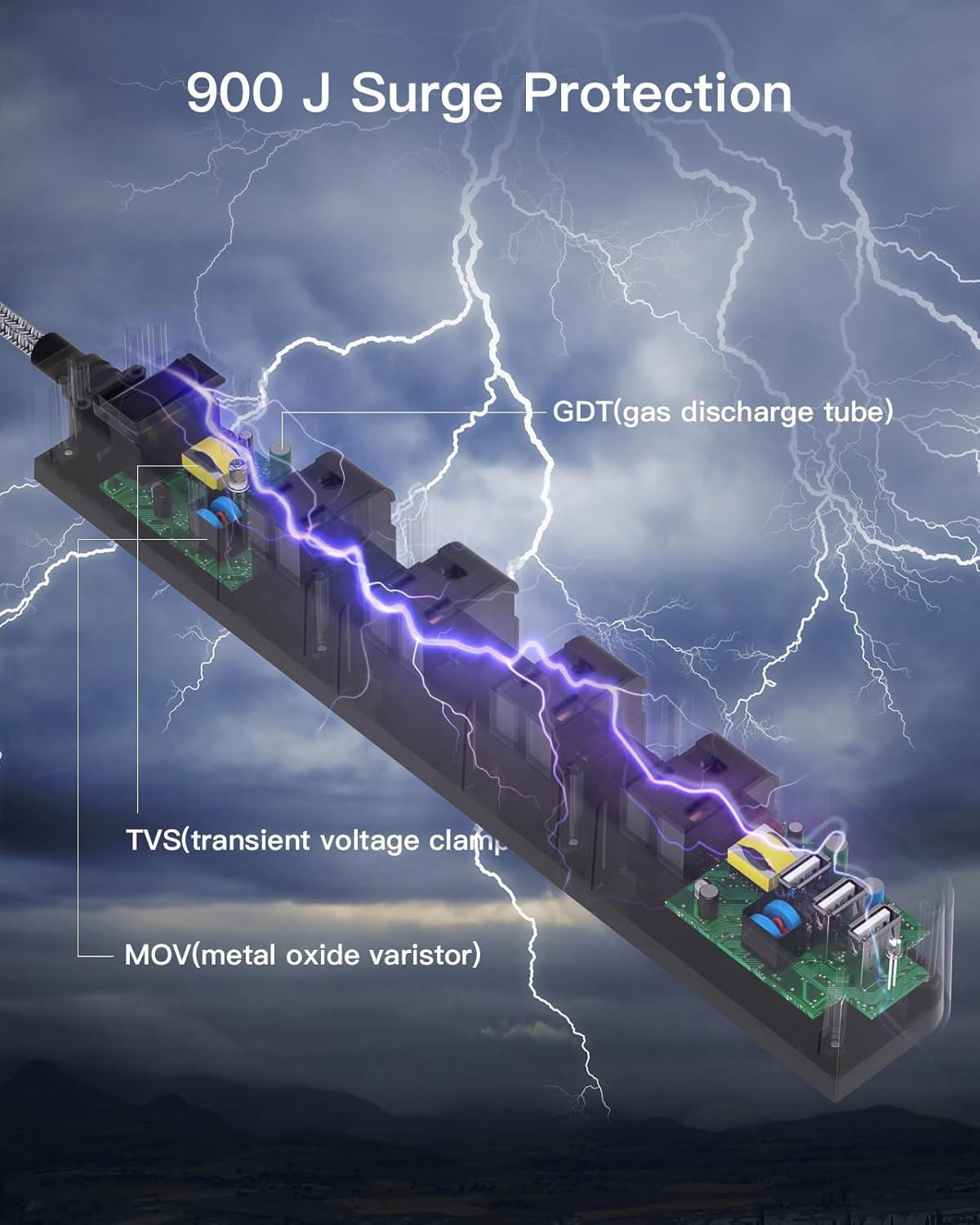 - 【Surge Protection】- The electric strip has a 900-Joule energy rating providing a reliable power extension cord to protect your devices and appliances: TV, printers, computer. It secures your electronic devices from overload, short circuit, power spikes, lightning strikes, or fluctuations. (The “SURGE PROTECTED” soft indicator light on to show your devices are protected).