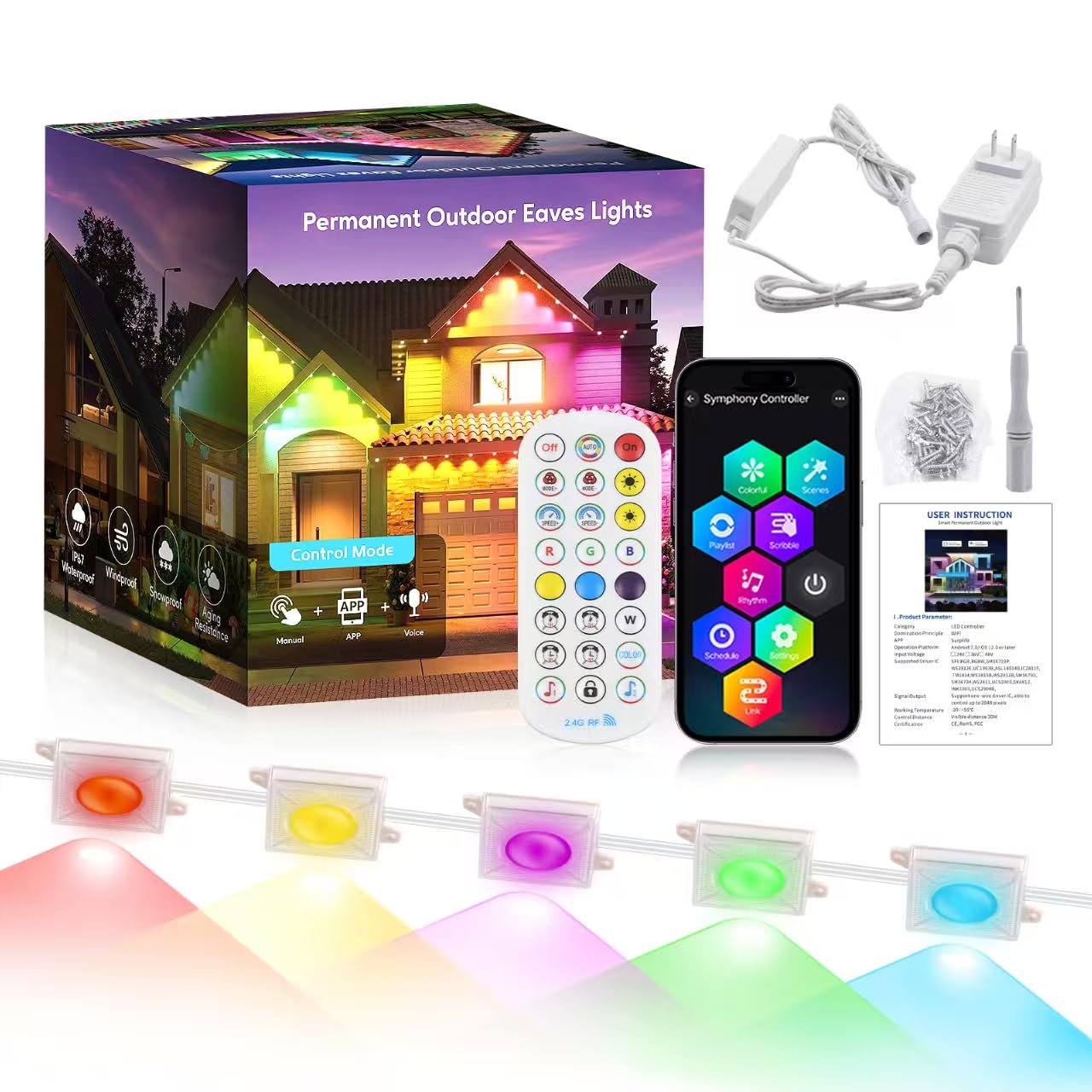 Specification: Outdoor Permanent Lights for House 100ft, Smart Halloween Lights with 60LEDs RGB IP67 Waterproof, Support with Alexa &Google Assistant Smart Voice Control,Sync to Music, DIY… by ADLEDQYGD