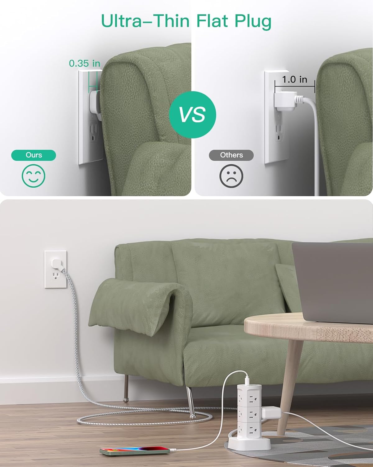 - ใFlat Extension Cordใ- with only 0.35 inch ultra slim design, the flat wall plug is thinner than traditional plugs, which can close to the wall easily, fits tight spaces behind sofa, nightstand, bookshelf and headboard. The braided fabric makes it tangle-free and more flexible, while also adds a decorative touch to any room space; fit to be home, aprtment, and college dorm room essentials.