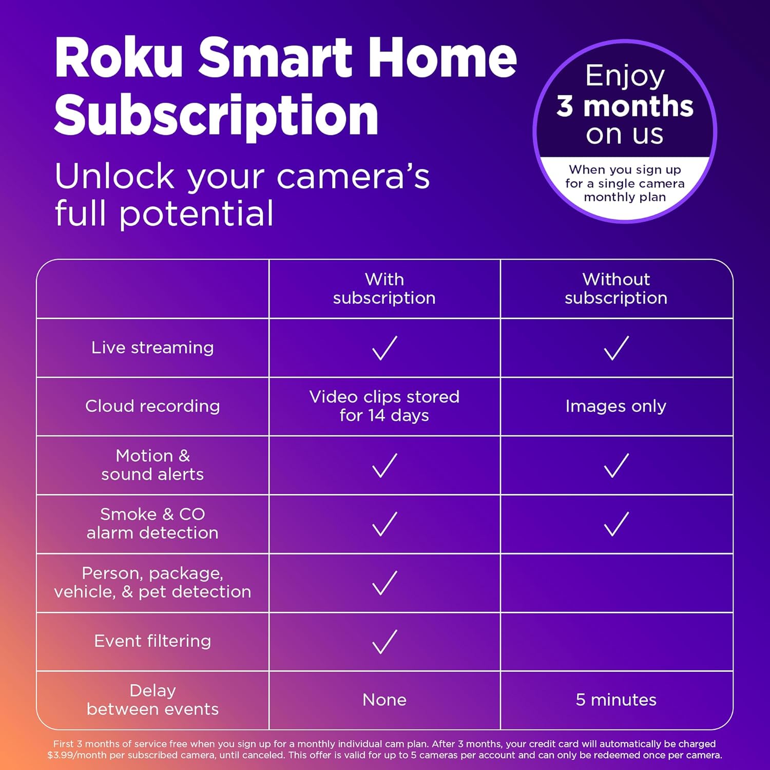 - Our treat: Get 3 months of a Roku Smart Home subscription on us when you sign up for the single camera monthly plan.