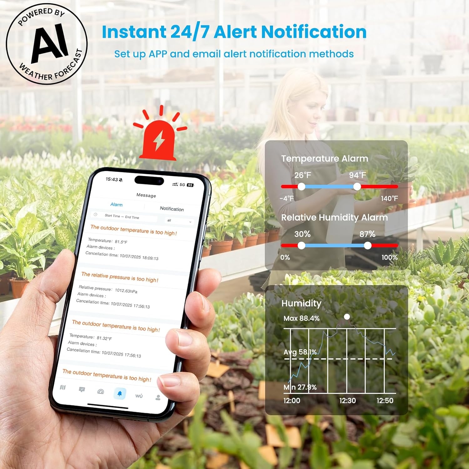 - 𝗪𝗶𝗙𝗶 + 𝟮𝟰𝗛/𝟳 𝗗𝗮𝘆𝘀 𝗔𝗜 𝗪𝗲𝗮𝘁𝗵𝗲𝗿 𝗙𝗼𝗿𝗲𝗰𝘀𝗮𝘀𝘁 + 𝗜𝗻𝘀𝘁𝗮𝗻𝘁 𝗔𝗹𝗲𝗿𝘁𝘀:Connect via WiFi to the Weatherseed App for AI-driven 24hour/7 days hyper-local forecasts, real-time tracking, and instant alerts via app or email for temperature, humidity, and barometric shifts—ideal for safeguarding homes, gardens, or small farms.(Only Supports 2.4G Wi-Fi)