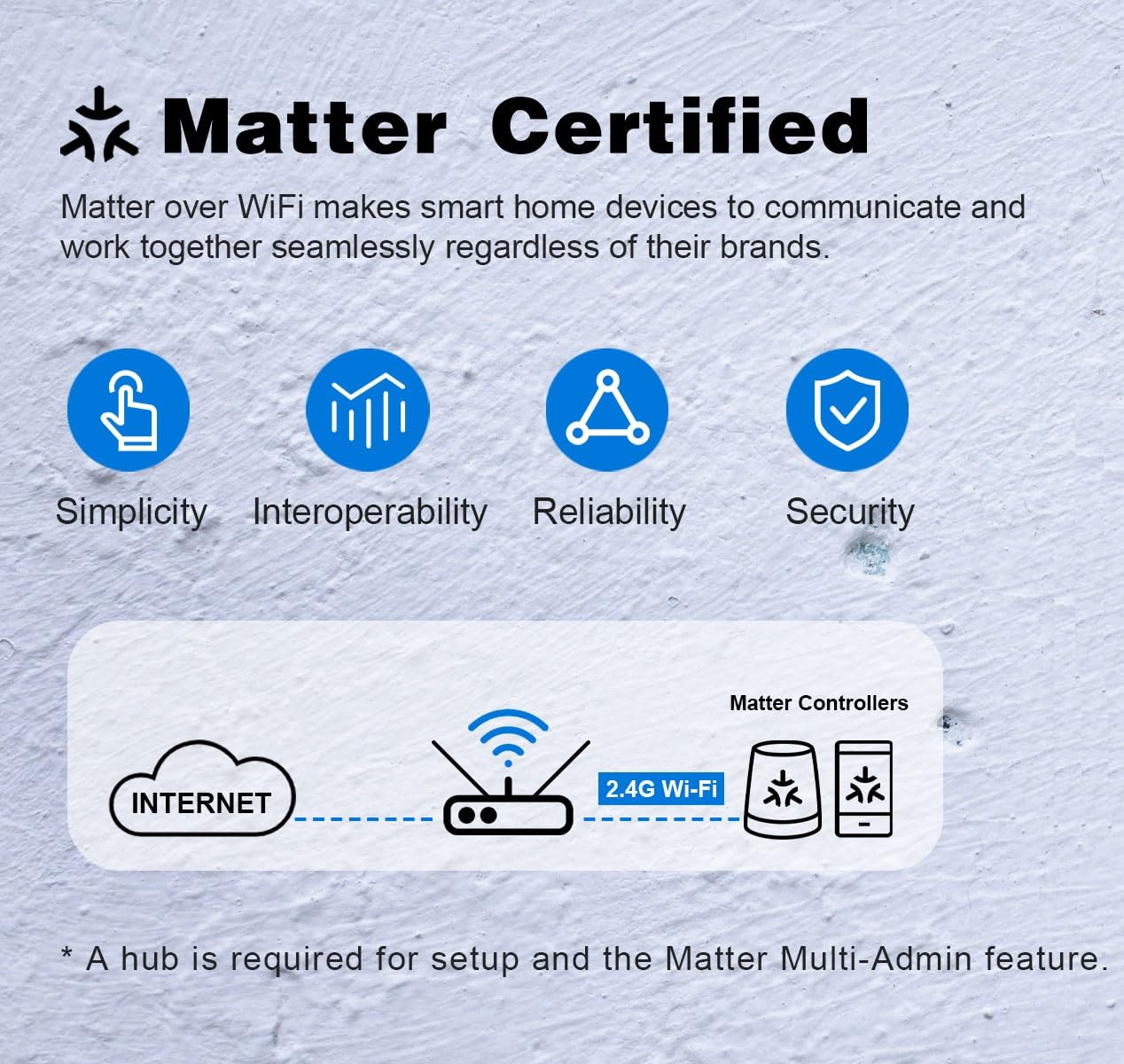 About Smart Outlet with Matter, App & Voice Control, No Bridge, Works with Apple Home, Alexa, Google Home, SmartThings, 100% Privacy, White, 15A, 2-Pack