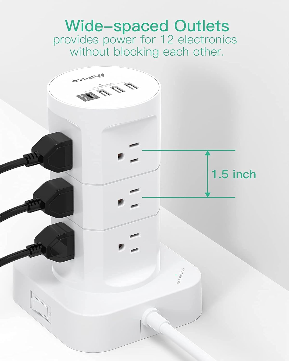 - 【Wide Space & Space Saving】- With the vertical tower design, this surge protector takes a little space while powering even though 16 devices at same time. The steady base with anti-slip mat on the bottom effectively avoid wobbling and slipping around. 12 AC outlets with long space in between, it easier to use for all kinds of equipment and without blocking each other.