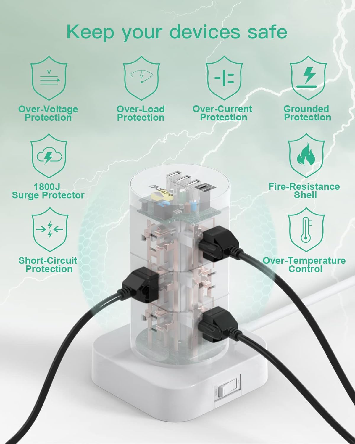 - 【16 IN 1 Tower Power Strip with USB】- This surge protector power strip with 12 AC outlets(1875W/15A) and 4 smart USB (1 USB C) charging ports(5V/4.5A) can power up to 16 electronic devices simultaneously. Integrated circuit breaker and 1800 Joules protection rating ensure the safety of your electronics.