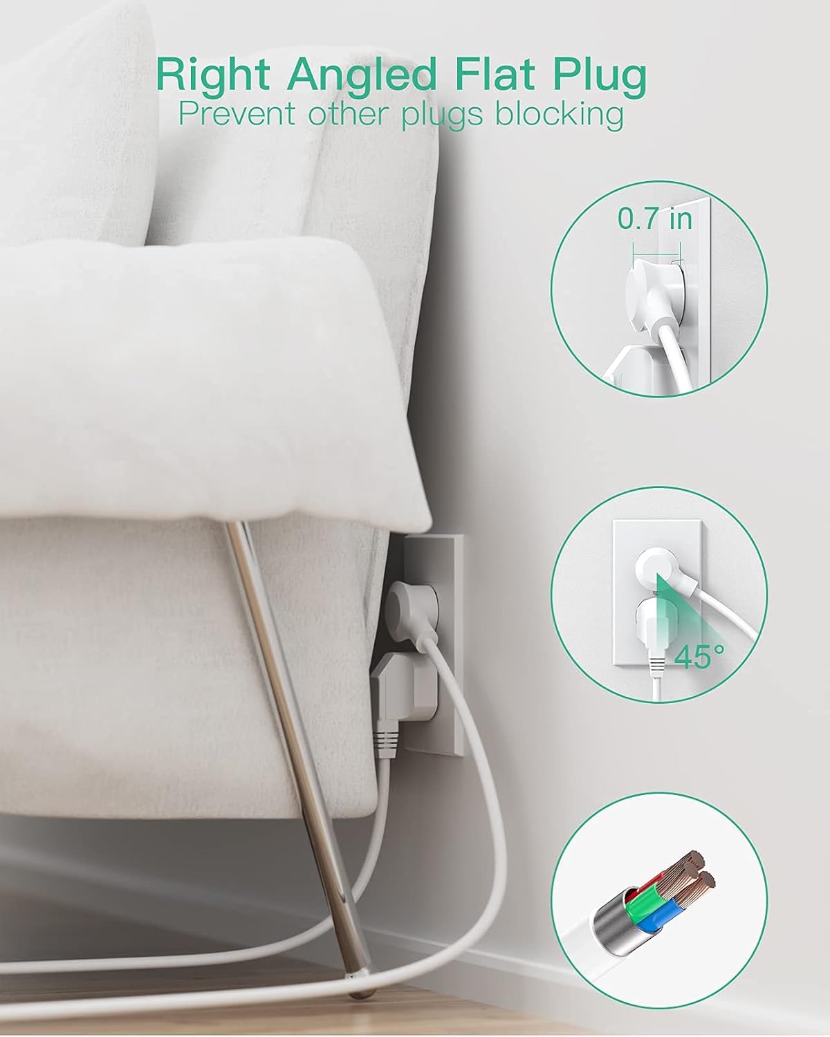 - 【UL Approved Extension Cord & Flat Plug】- The Low-profile flat plug fits easily in tight spaces, 45° right angle plug design prevents other plugs blocking. The 6FT upgraded extension cord is UL approved, and made of pure copper, which is very thick and has better current carrying capacity (15A). Environmental protection and fire-resistance PC shell with flame retardant at 1382℉ makes it more durable and longer lifetime.