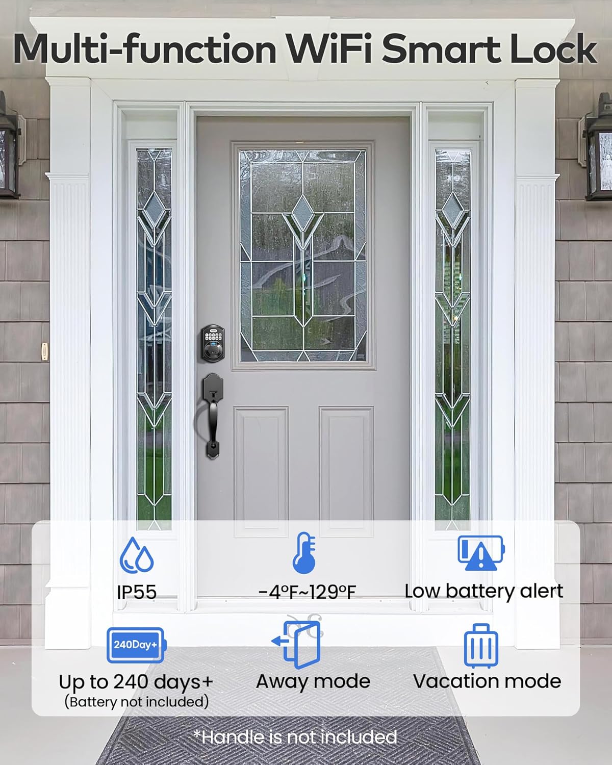 - Built to Last – Certified & Weather-Resistant: This keyless entry door lock is BHMA certified for over 200,000 uses, IP55-rated for snow, rain, and changing climates. Powered by 8 AA batteries (not included) lasting up to 8 months. Low-battery alerts keep your home protected without interruptions
