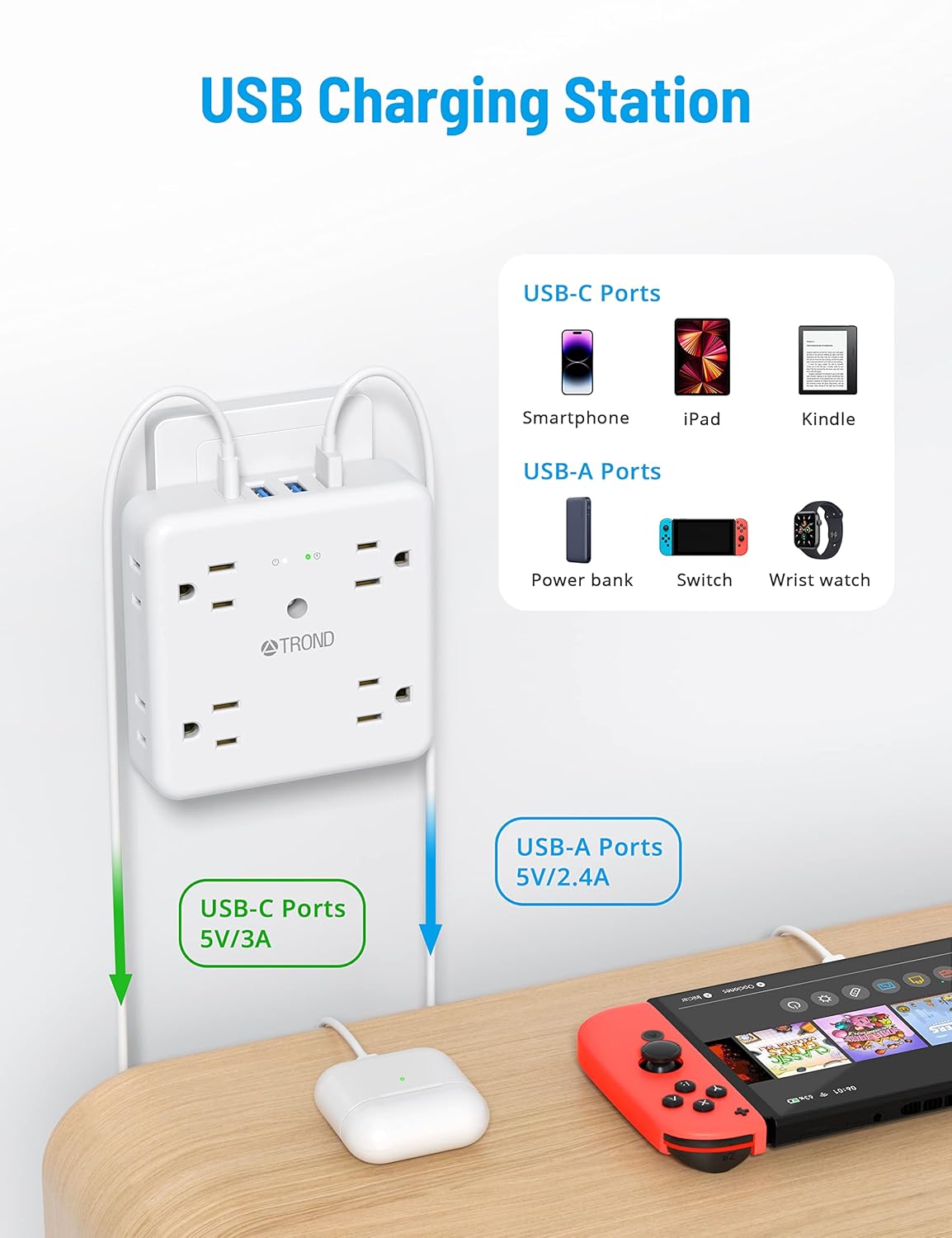 - USB Wall Charger: TROND multiple plug outlet has 3 USB A and 1 USB C wall charger on the upside, delivering charge speed up to 3.0A (USB A: 2.4A USB C: 3.0A max. output). Space-saving USB charging station for bedside, dorm room, desktop, and office