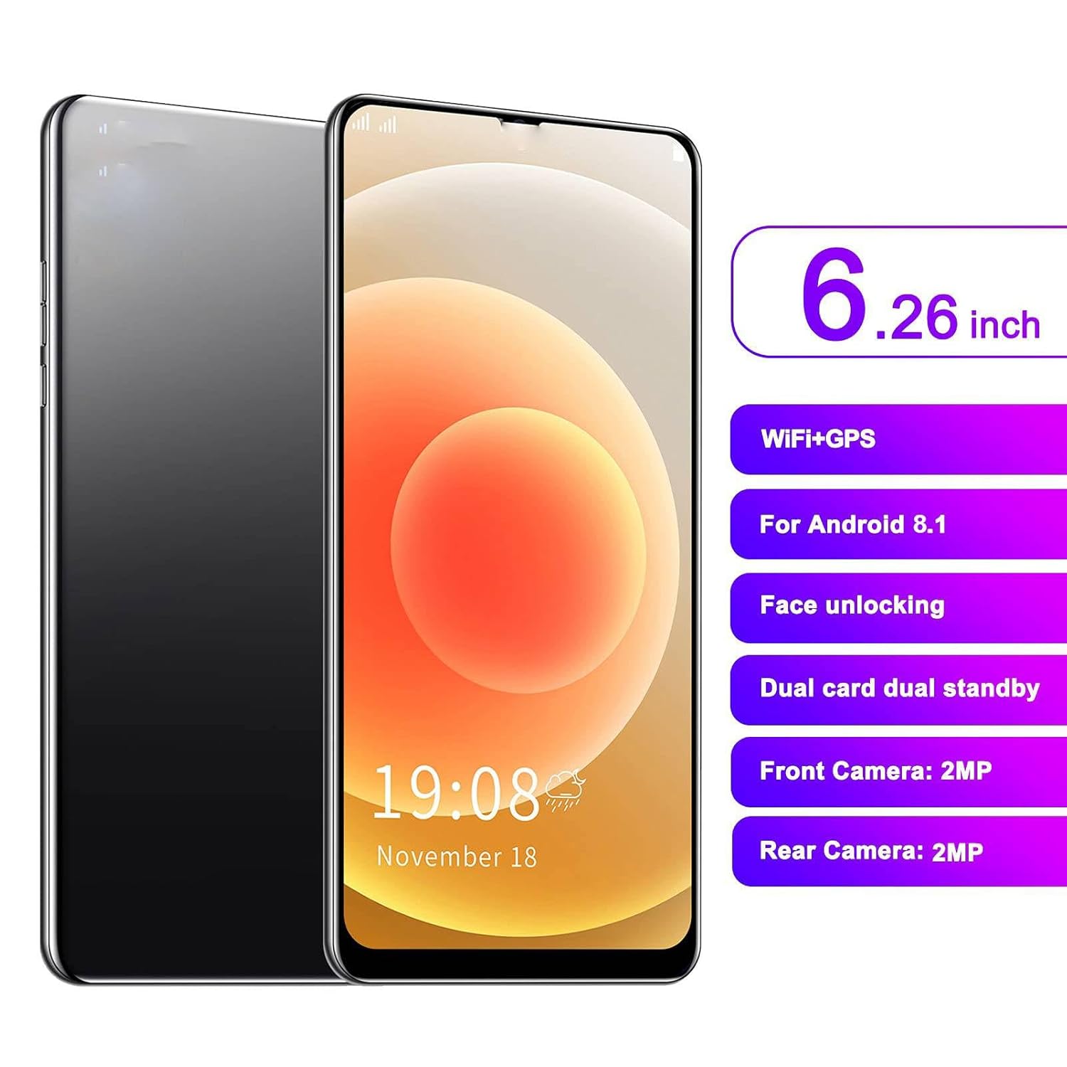 About ASHATA Unlocked Android Smartphone Cellphone, 6.26in FHD Screen 2G 3G Net Mobile Phone, Camera Front 2MP Rear 2MP, 1GB+8GB+128GB Extended Memory, 1950mah Fast Charging (Black)