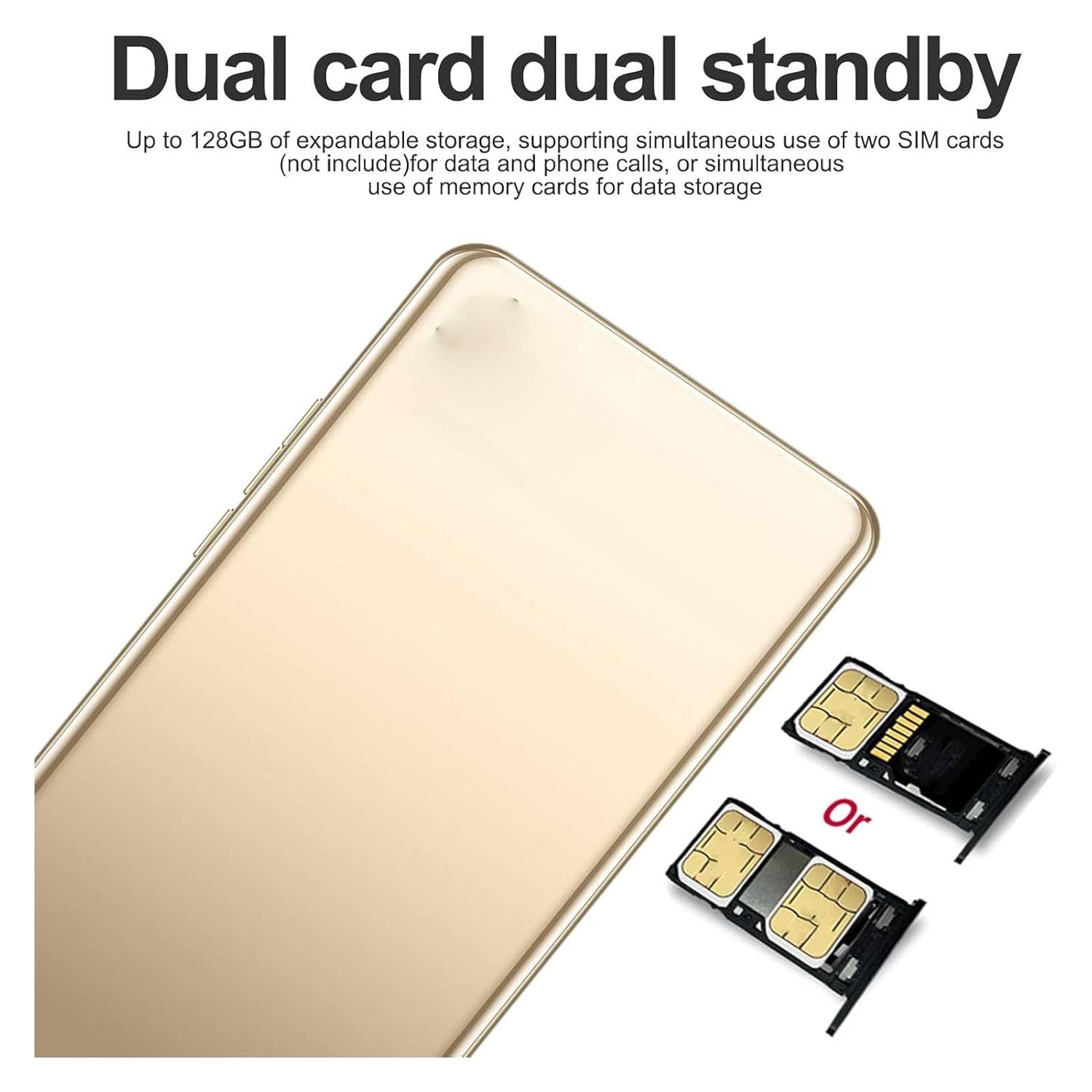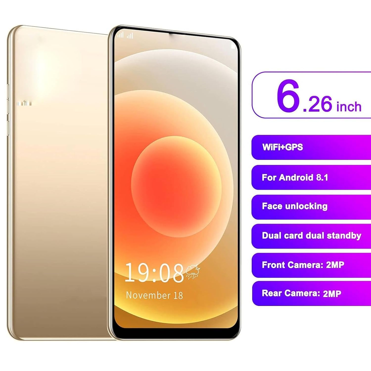 Specification: ASHATA Unlocked Android Smartphone Cellphone 6.26in Full HD Screen, 2G/3G Cellphone, Camera Front 2MP Rear 2MP, 1GB + 8GB + 128GB Extended Memory, 1950mah Fast Charging (Gold) by ASHATA