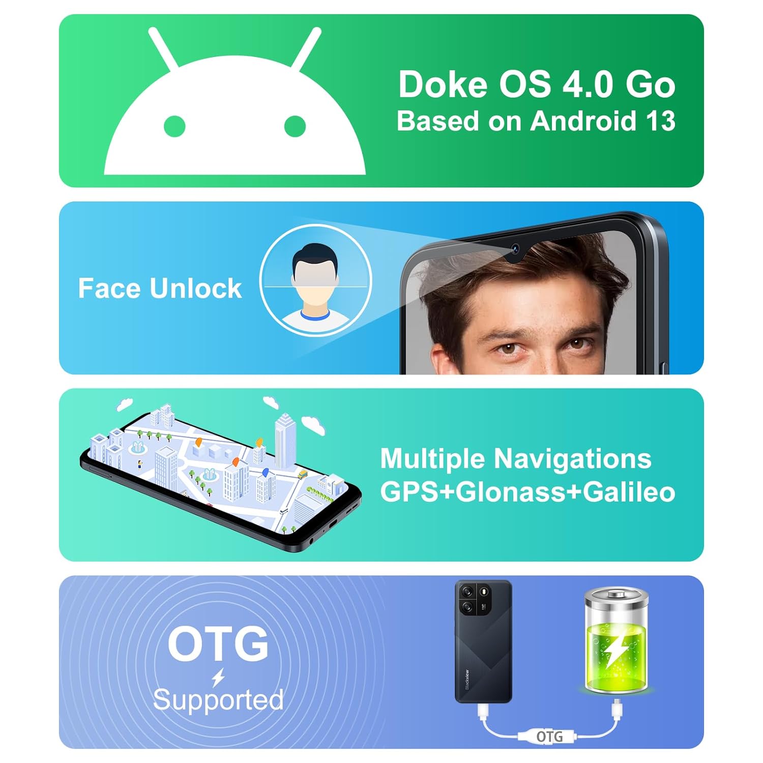 - 【2 Years Guarantee Service + Multi-Function】 Our shop guarantees all Blackview phones for 2 years. Should any issues arise, reach out to us for prompt assistance. This 4G dual sim phone features 3 card slots, accommodating 2 nano SIM cards + 1 micro SD/TF card (SIM/SD not included). Support Face ID Unlock. Benefit from GPS, GLONASS, and Galileo navigation.