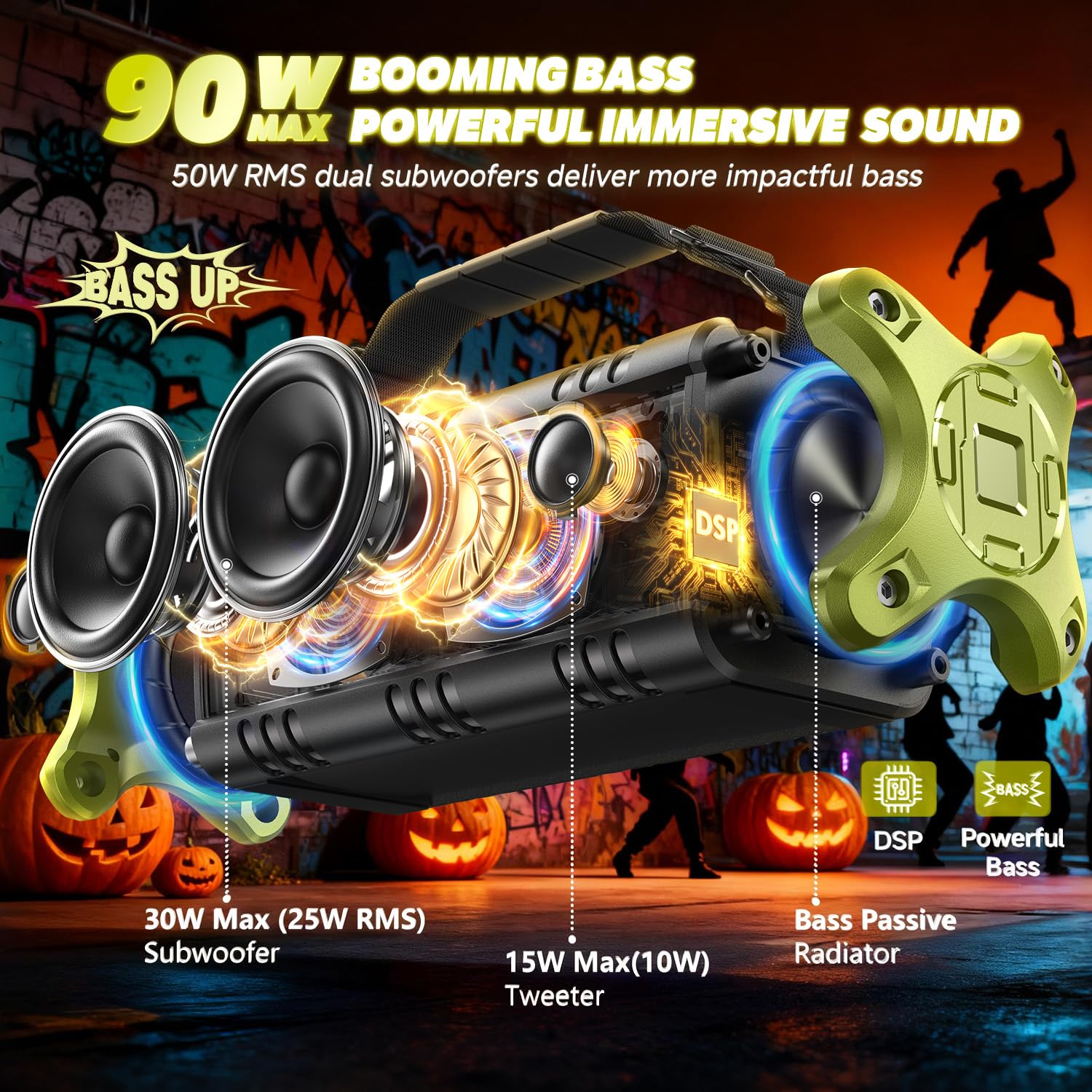 About Bluetooth Speaker, 90W Max Loud Portable Speakers Wireless with Subwoofer *2, 50W Deep Bass Boombox/ IPX6 Waterproof/40H/EQ/Dual Pairing/TF/AUX, Large Outdoor Rugged Speaker for…