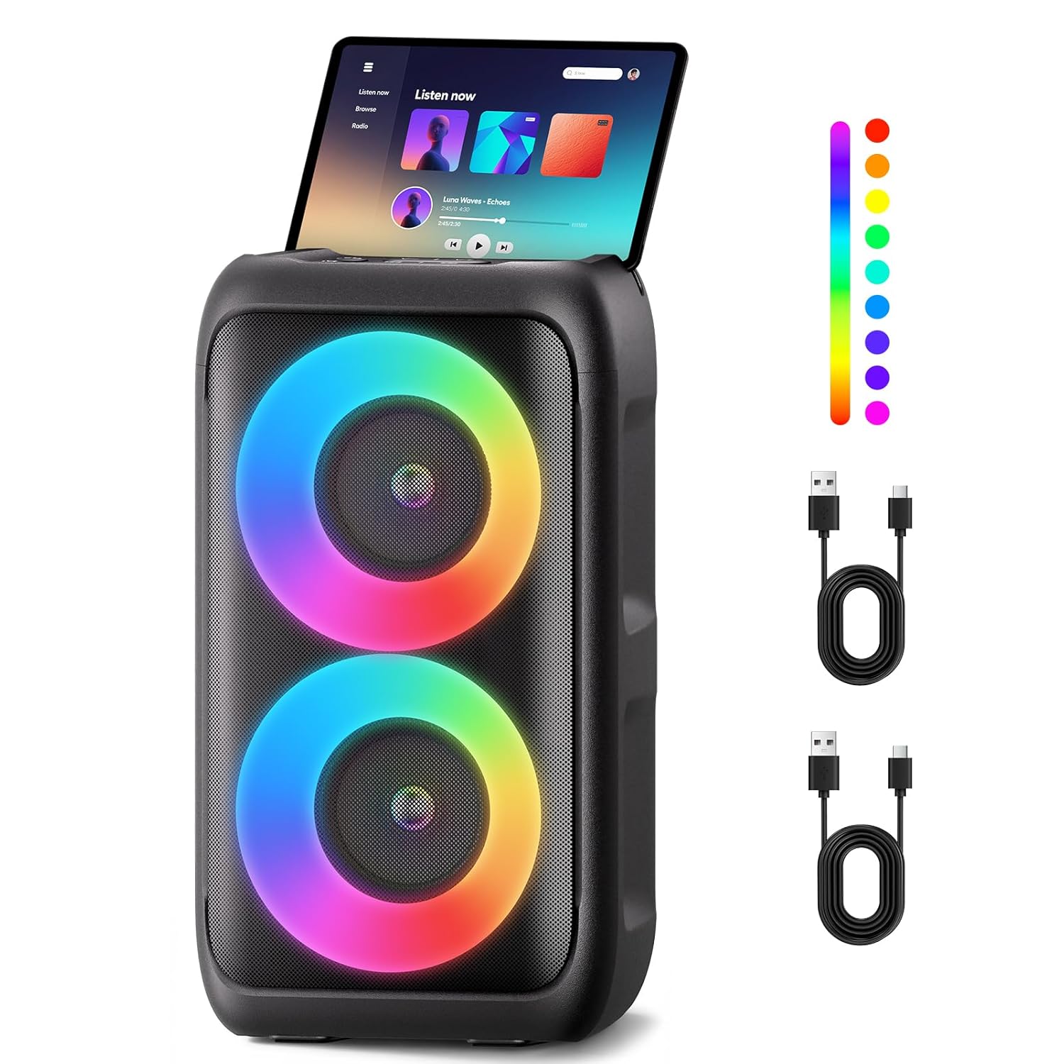 - 【Multifunctional Party Speaker】This bluetooth speaker can play music,karaoke, and amplify.We send two rechargeable wireless microphones,bluetooth speaker with microphone let us singing anytime, anywhere. Advanced Bluetooth 5.3 ensures broad compatibility with computers, tablets, phones, TVs, and more. It also supports AUX input, TF cards, USB drives, wired microphones, and instruments (via 6.5mm jack). The speaker’s top design allows for portability and supports holding your phone, tablet, or other devices. This is your ideal home party speaker.Note: The tablet above the party speaker is not included in the package.