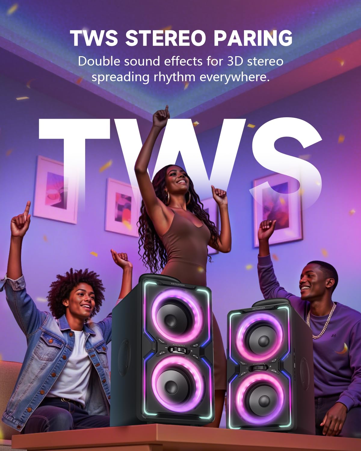 This speaker is an absolute powerhouse. The sound is loud, clear, and full of deep bass even at max volume. The light sync feature adds a whole new vibe to gatherings, and the battery life is incredible. I used it all day without needing a recharge. The surround sound really fills the space, and Bluetooth 5.3 makes connection fast and stable. Whether it’s a warehouse gathering or a movie night, this speaker brings the energy every time.