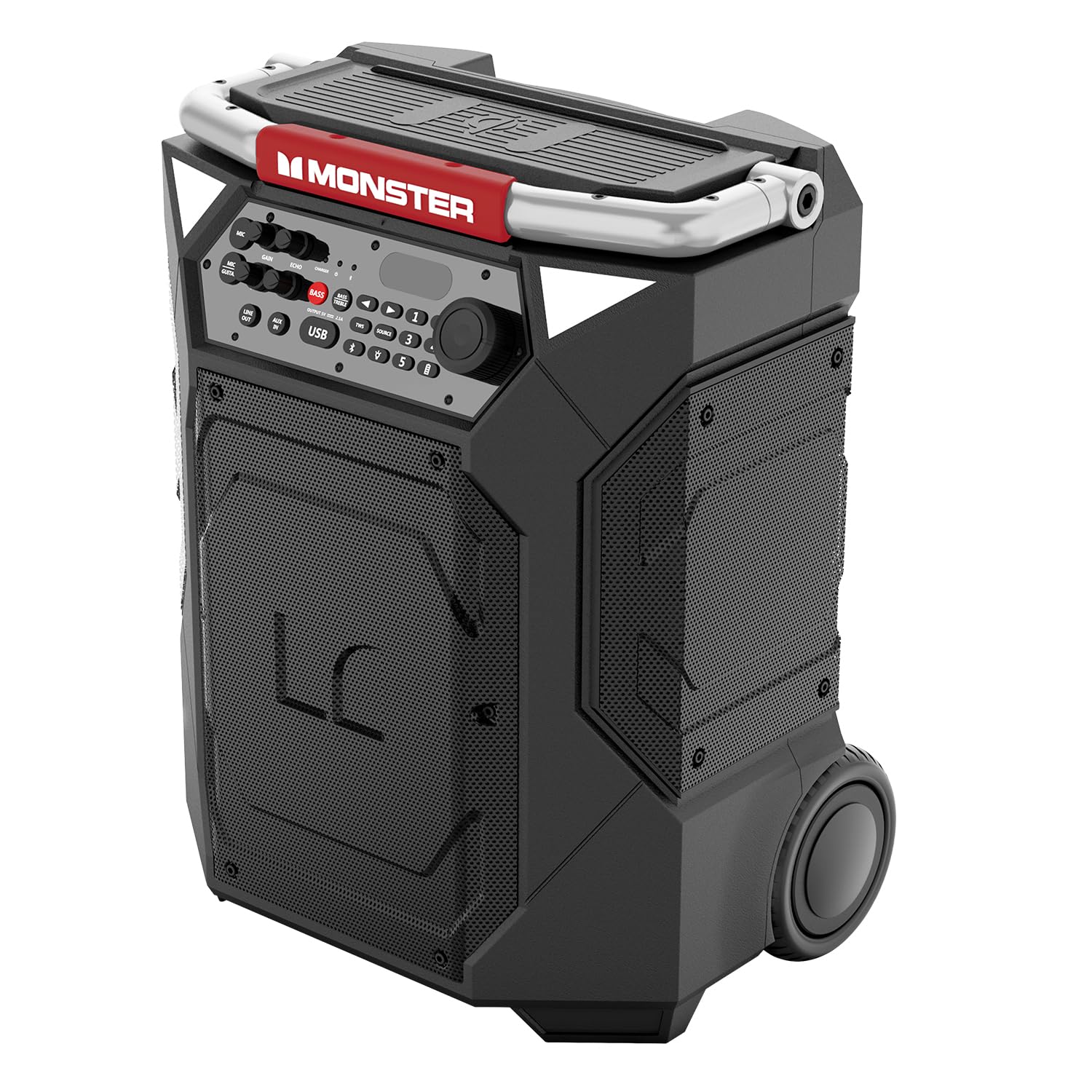 - THE COMPLETE PACKAGE: Rugged oversized 5″ wheels, to help with rough terrain. Adjustable top handle to allow for a phone or tablet to position upright. Built-in LED lighting to help view the controls as the lights go down and a telescoping handle for transportation. The Monster Rockin’ Roller 360 also features QI Wireless charger, a USB port, and includes a microphone for Karaoke/PA Speaker use.
