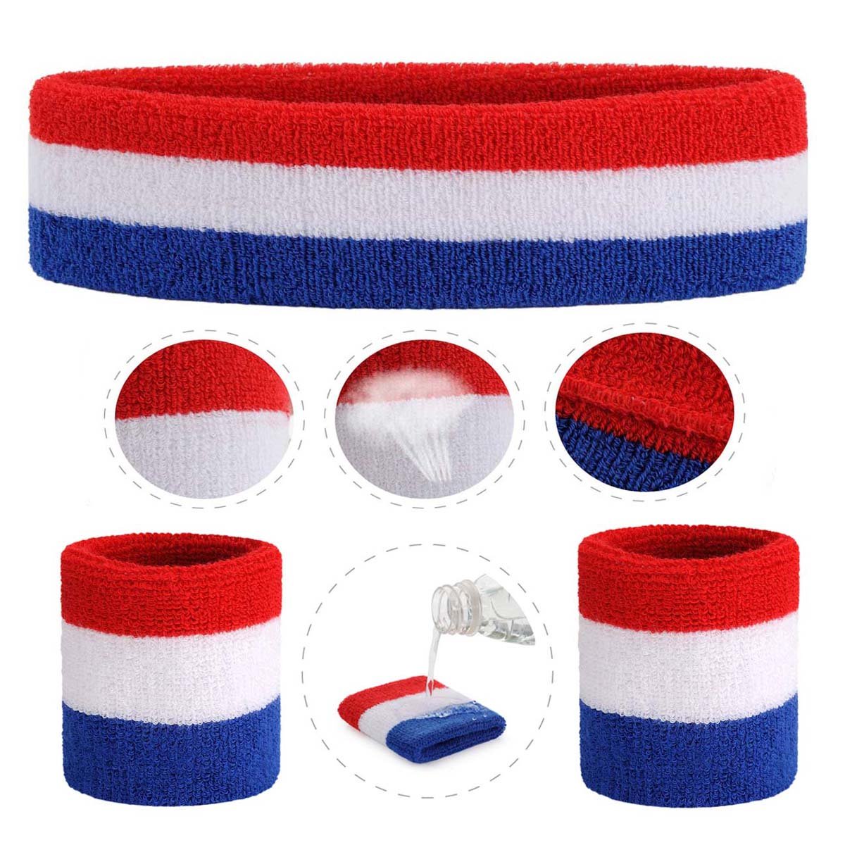 - Package include 3 Pieces: 1 x Red White & Blue Stripped Sweatbands, 2 x Red White & Blue Stripped Wristbands. Headbands/wristbands for women men girls boys, great for gym workout, yoga or 80s/90s costume.