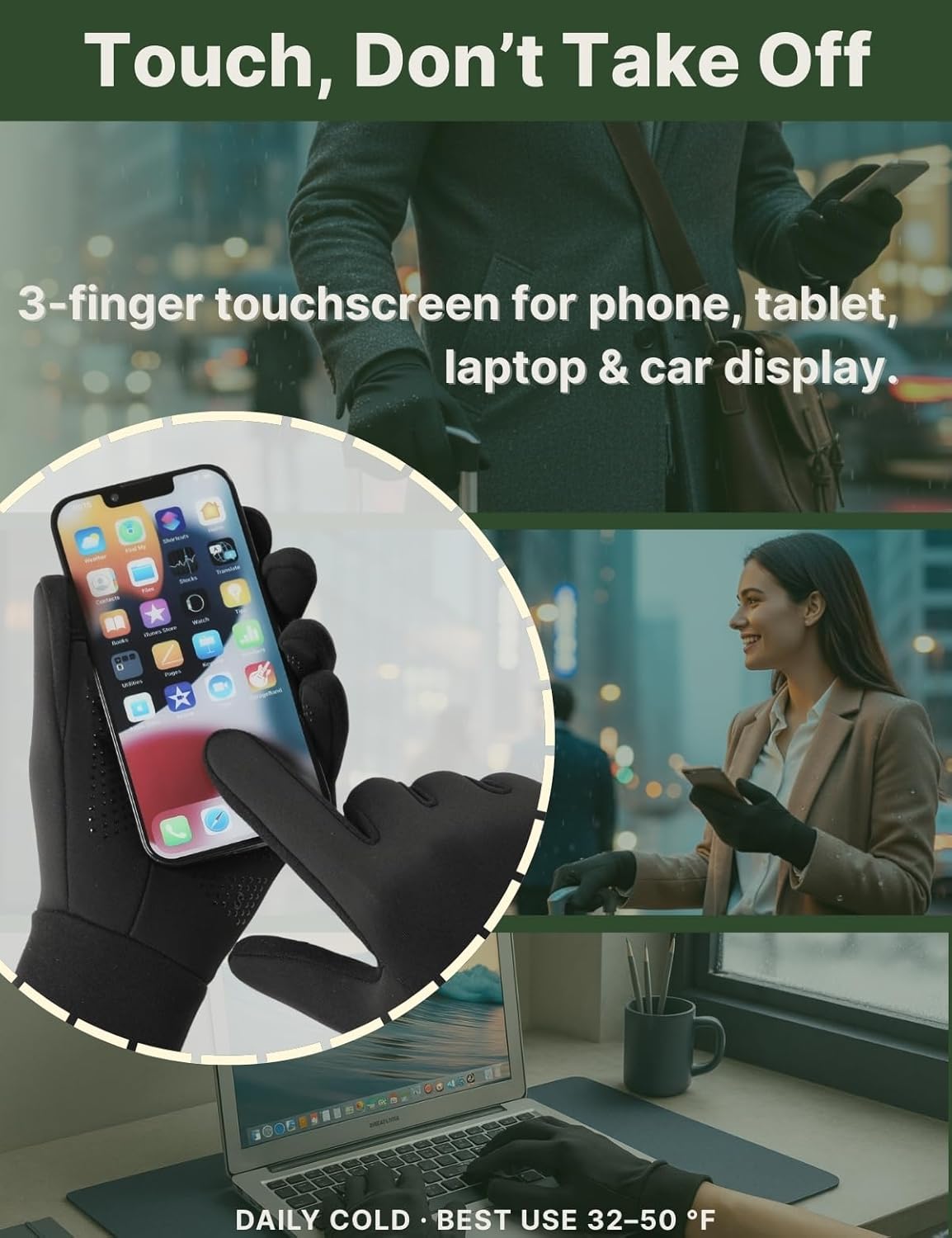 - SENSITIVE 3-FINGER TOUCHSCREEN: Conductive yarn on thumb/index/middle works with touchscreen phone, iPhone, iPad, tablets, GPS—easy texting and maps for commuting, cycling, running, hiking, driving.