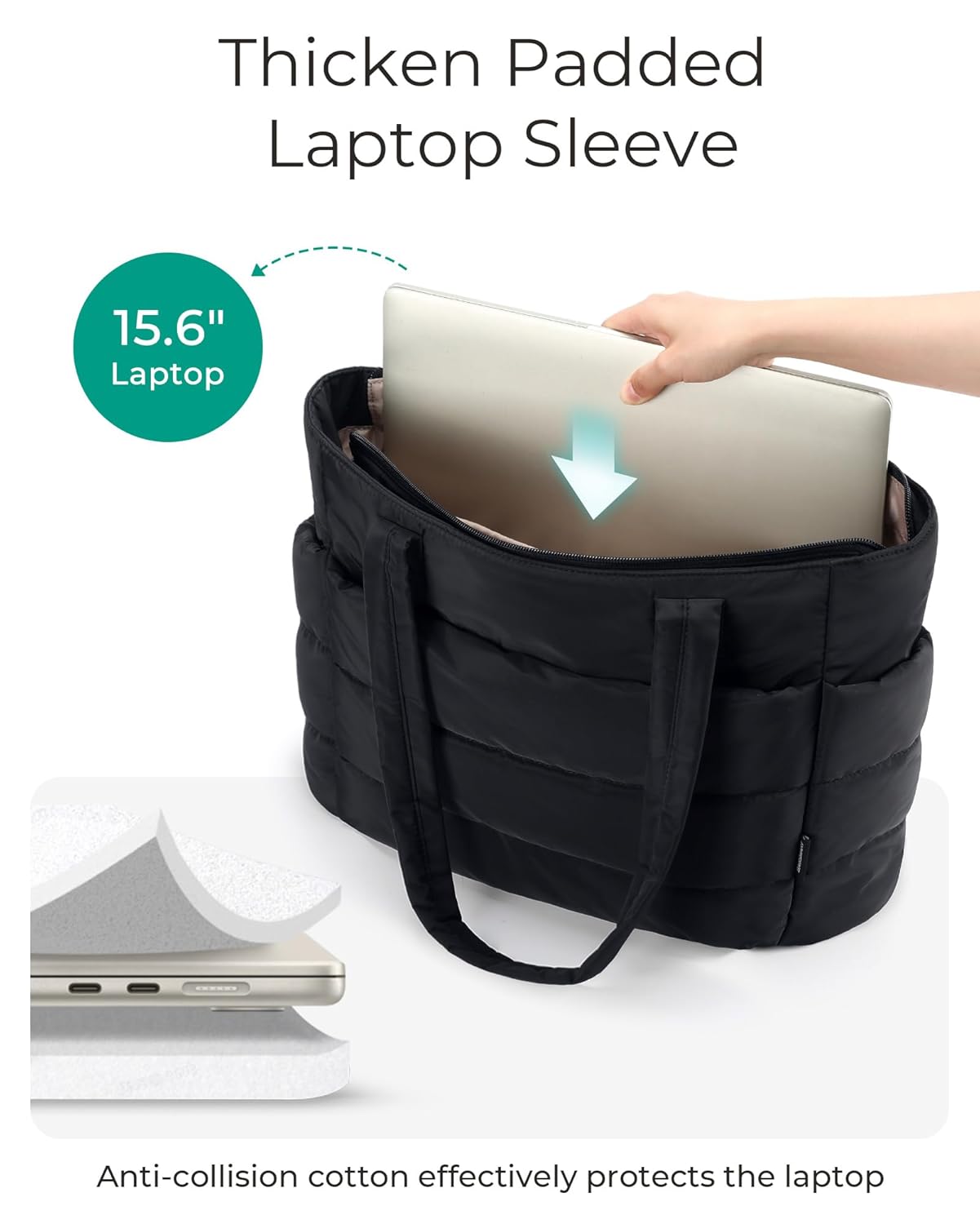 I am so impressed with this tote! It’s lightweight but surprisingly spacious – it easily holds my laptop, water bottle, and even my gym clothes without feeling bulky. The quilted puffy design is super trendy, and I’ve gotten so many compliments on it already.