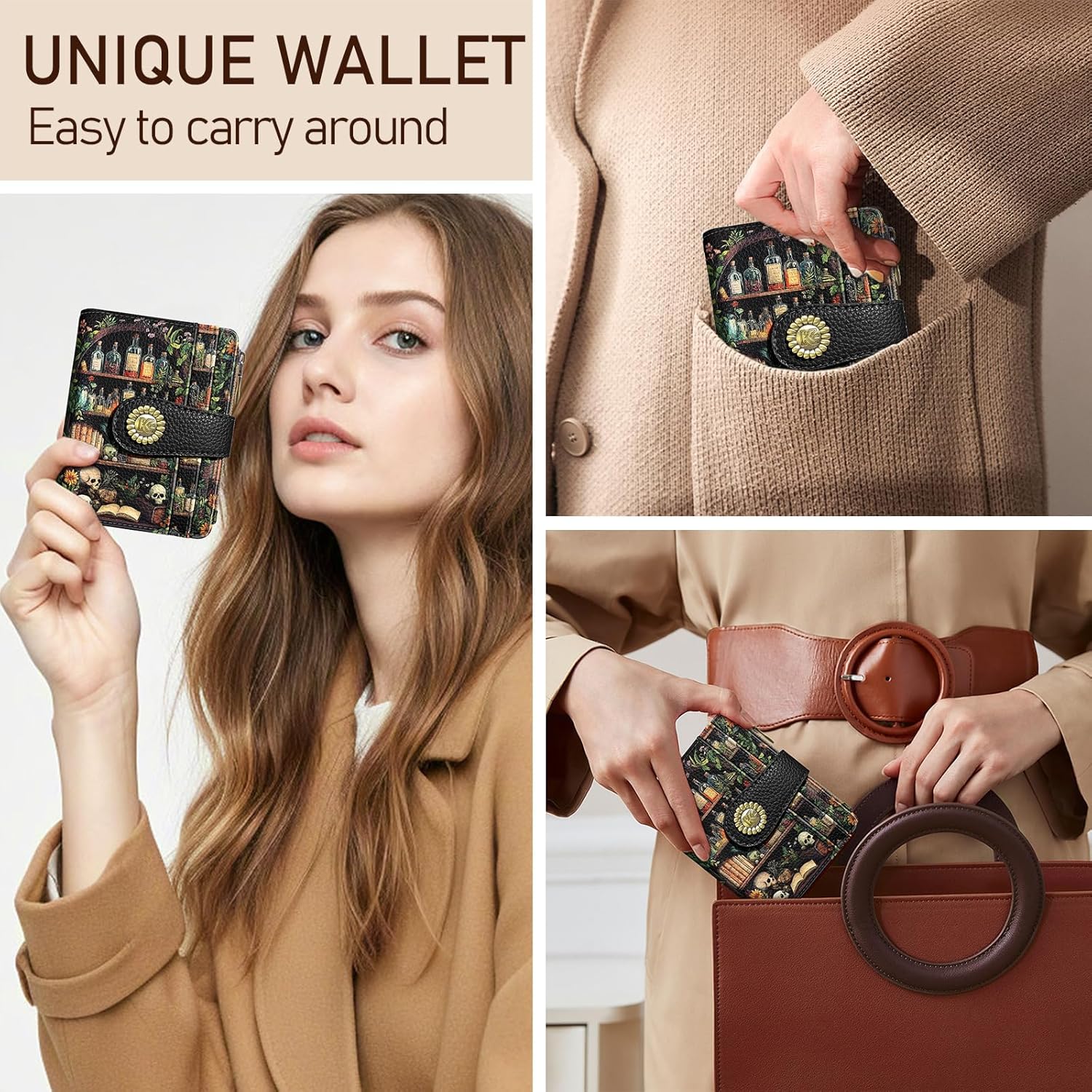 - Stylish Bifold Design: Printed with bookshelves, skulls, books, flowers and glass bottles, this goth skull wallet features a secure bifold structure for effortless portability; Its small profile fits into pockets, purses, or clutch bags, offering versatile functionality for work, events, dating or casual outings; A minimalist yet fashionable credit card wallet for every occasion