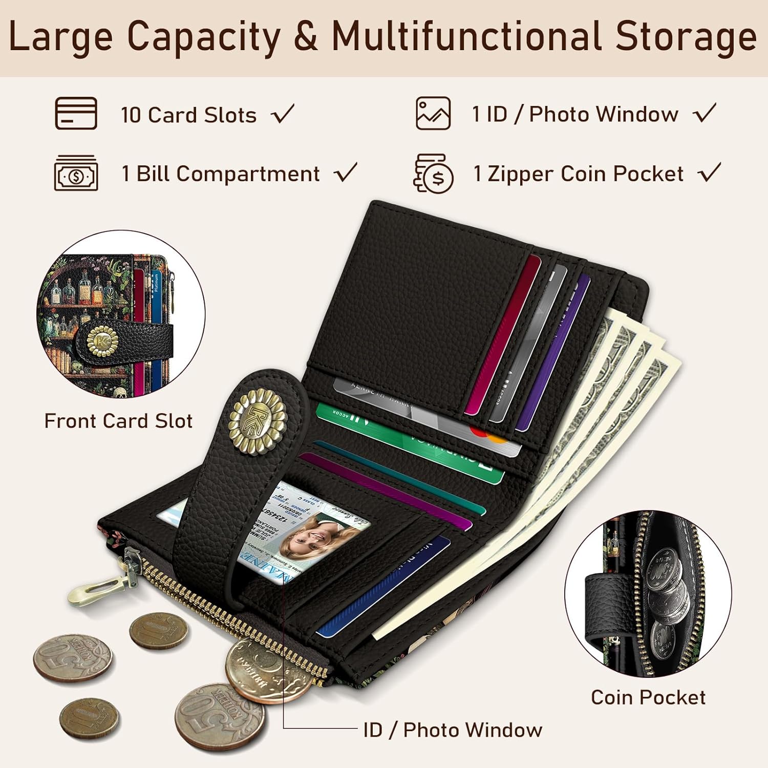 - Large Capacity Storage: Designed with 10 card slots, 1 clear ID window, 1 full-length bill compartment and 1 zipper coin pocket, this zip leather wallet maximizes storage without bulk; Ample space to securely store credit cards, ID card, driver’s license, tickets, change, bills, coins, and essentials; Great for daily use, it balances large capacity with a compact, travel-ready size